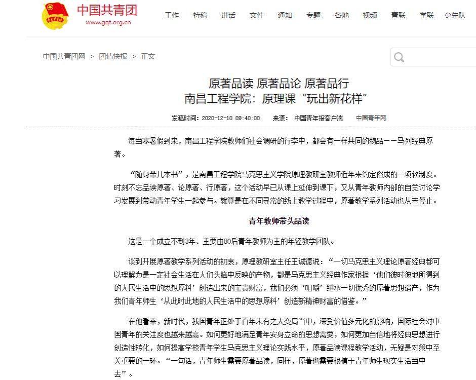 10月12日,《中国青年报》第11版报道我校原著品读活动,用马克思主义理论分析中华优秀传统文化,用中华优秀传统文化呼应马克思主义理论。2020年12月10日,《中国青年报》第6版曾以《南昌工程学院:原理课“玩”出新花样》为题报道过上述活动。
