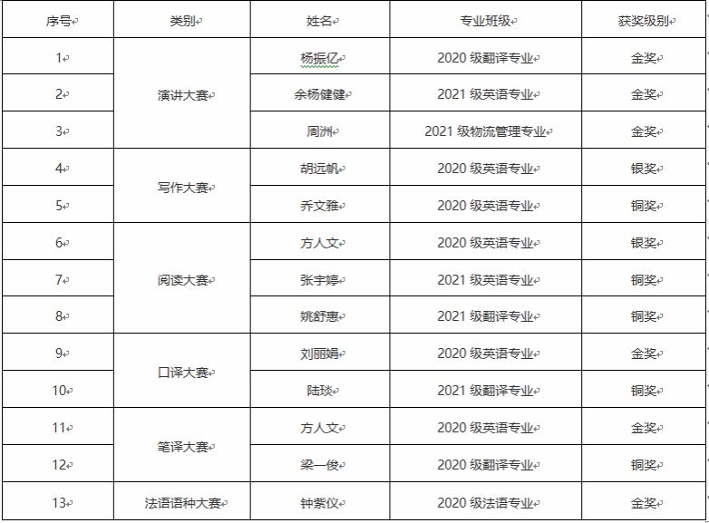11月4日,外研社·国才杯“理解当代中国”全国大学生外语能力大赛江西赛区复赛落下帷幕,我校学子喜获佳绩,共荣获金奖6项,银奖2项,铜奖5项,英语、法语、翻译和非外语专业均斩获金奖,获奖面和获奖总数量取得新突破。在演讲比赛中,我校是所有选手均获金奖的唯一高校。各项获金奖的选手将于12月代表江西参加全国决赛。(文/曾玲娟 图/周薇薇 责任编辑 潘旭 罗婷)