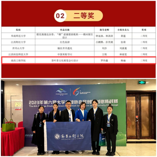 第六届大学生绿色发展创新创意挑战赛围绕“加快建设美丽江西,促进人与自然和谐共生,深入践行绿水青山就是金山银山理念,全面落实‘美丽江西’建设规划纲要,更高标准打造美丽中国‘江西样板’”这一主题进行,旨在为大学生搭建施展才能的舞台,为推动会展人才建设提供新方案、为会展业高质量发展提供新动能。全国50多所高校、120支队伍、500多名选手参加决赛。人文与艺术学院首次参加该赛事,经过初赛选拔,决赛路演,《茶叶茶文化展览会VI设计》作品获得预赛第六名,国赛二等奖佳绩。
