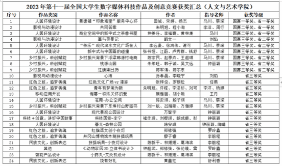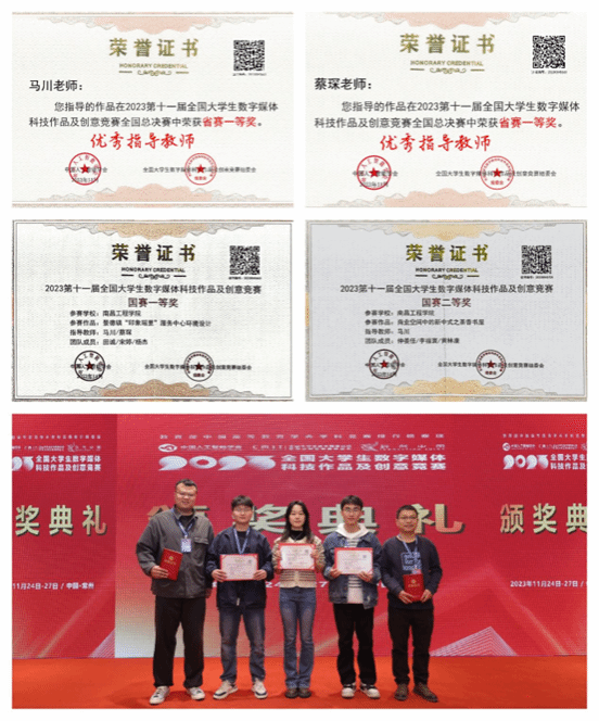 近日,2023年第十一届全国大学生数字媒体科技作品及创意竞赛与2023年第六届大学生绿色发展创新创意挑战赛国赛分别在常州、南昌落下帷幕。人文与艺术学院喜获一等奖1个,二等奖3个,三等奖6个,以及省级奖励33个,人文与艺术学院环境设计专业教师蔡琛、马川荣获“优秀指导老师”称号。