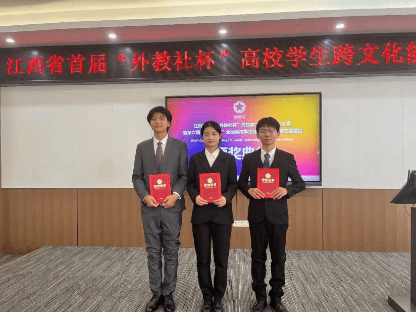 11月25日至26日,江西省首届“外教社杯”高校学生跨文化能力大赛在南昌大学举行,我校由2021级英语专业钟渝军、2021级物流管理专业钟伊敏、2023级财务管理专业吴中瀚同学组成的参赛队伍经过紧张激烈的复赛和决赛,从全省40所高校中脱颖而出,荣获江西省二等奖。