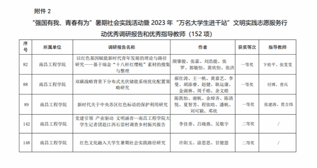 学校荣获优秀组织奖(全省15项),“手绘初心使命 追寻红色足迹”实践团等4个团队成果获优秀实践成果,《以红色基因赋能新时代青年发展的理论与路径研究——基于瑞金“十八杆红缨枪”素材的搜集与整理》等5个调研报告荣获“优秀调研报告”,“深耕红土 青春纪行”团学骨干实践等6个团队荣获“优秀团队”荣誉称号,张建涛等11位老师荣获“优秀指导教师”荣誉称号,许阳玉等8名同学获“优秀个人”荣誉称号。(文/图 魏靖丹 责任编辑 潘旭 罗婷)
