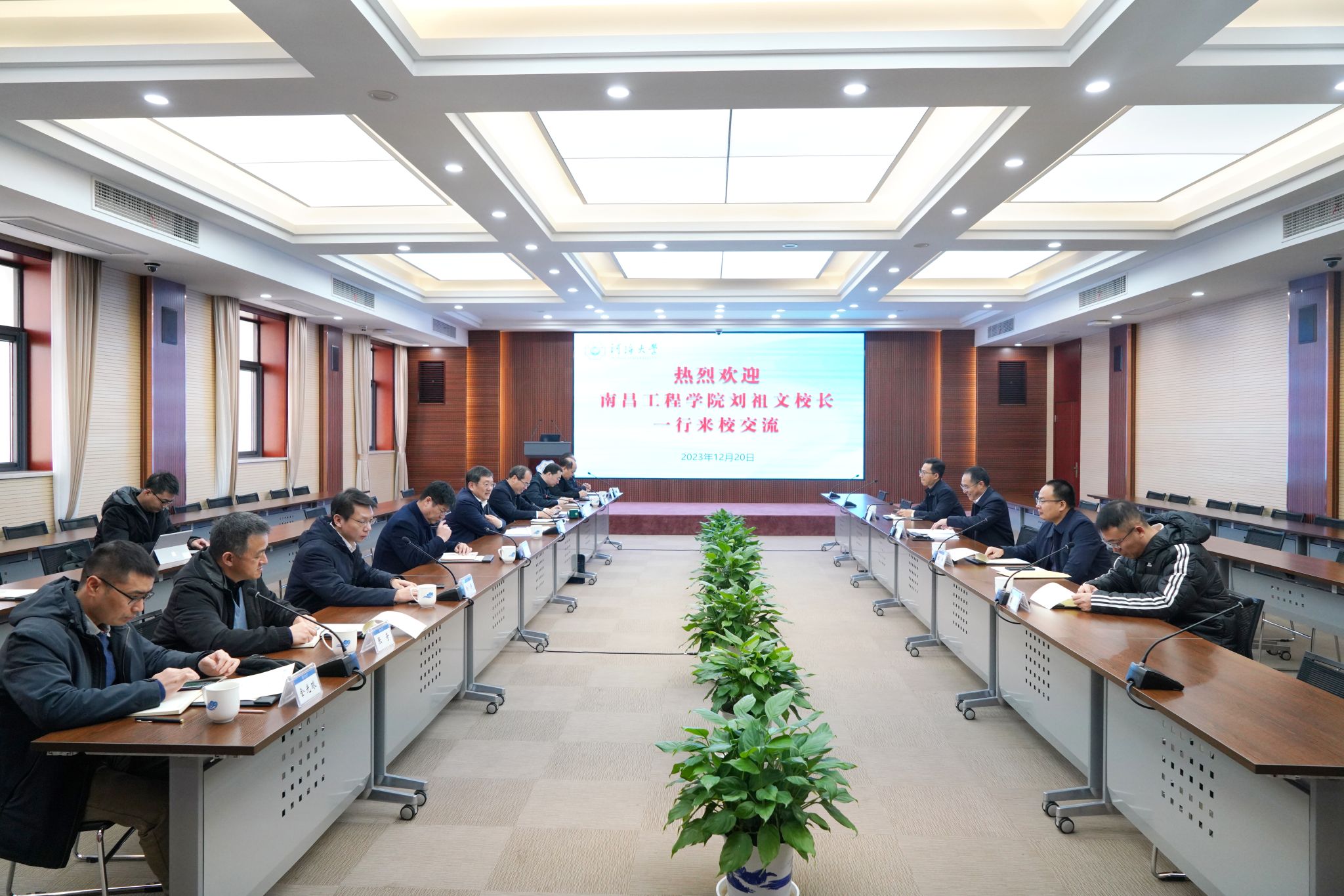 12月20日,刘祖文一行赴河海大学调研交流,河海大学党委书记唐洪武院士、副校长郑金海参加座谈。刘祖文代表学校对河海大学长期以来的支持和帮助表示感谢,并详细介绍双方共建科研平台的推进情况、存在困难和下一步打算,希望双方共同发力、整合资源,大力推进科研平台建设,为高层次人才培养、重大项目研发、联合科技攻关、社会服务等领域的合作提供载体支撑。唐洪武院士对刘祖文一行表示欢迎,并从机构设置、队伍组建、研究方向、保障机制等方面提出共建科研平台的具体举措,希望双方各自发挥资源优势和学科优势,围绕国家重大战略和江西水利行业发展需求,大力拓展人才培养、科研平台、科研项目、团队建设等领域的合作,共同服务国家经济社会发展。双方还就高层次人才交流、干部挂职培养等问题进行研讨。