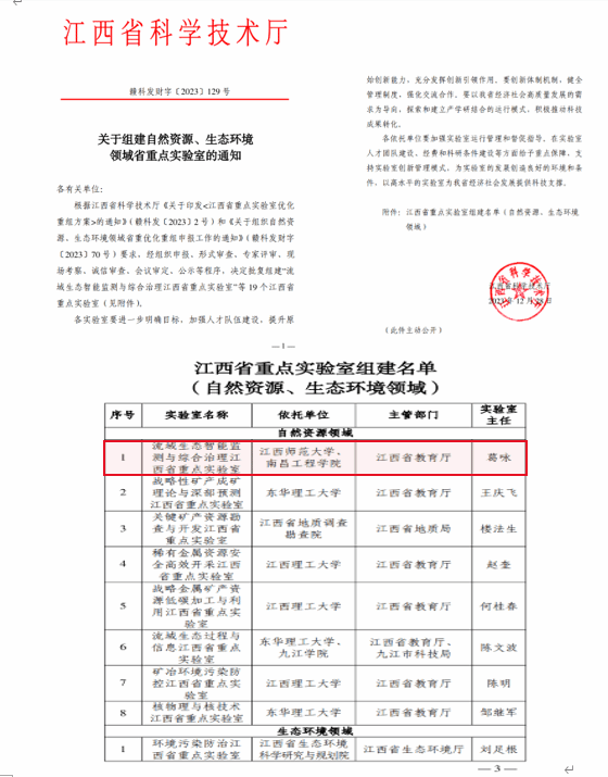 12月28日,江西省科学技术厅印发了《关于组建自然资源、生态环境领域省重点实验室的通知》,我校联合江西师范大学申报的“流域生态智能监测与综合治理江西省重点实验室”获批立项。这是我校首个重组获批的省级重点实验室。(文/图 崔建锋 责任编辑 潘旭 罗婷)