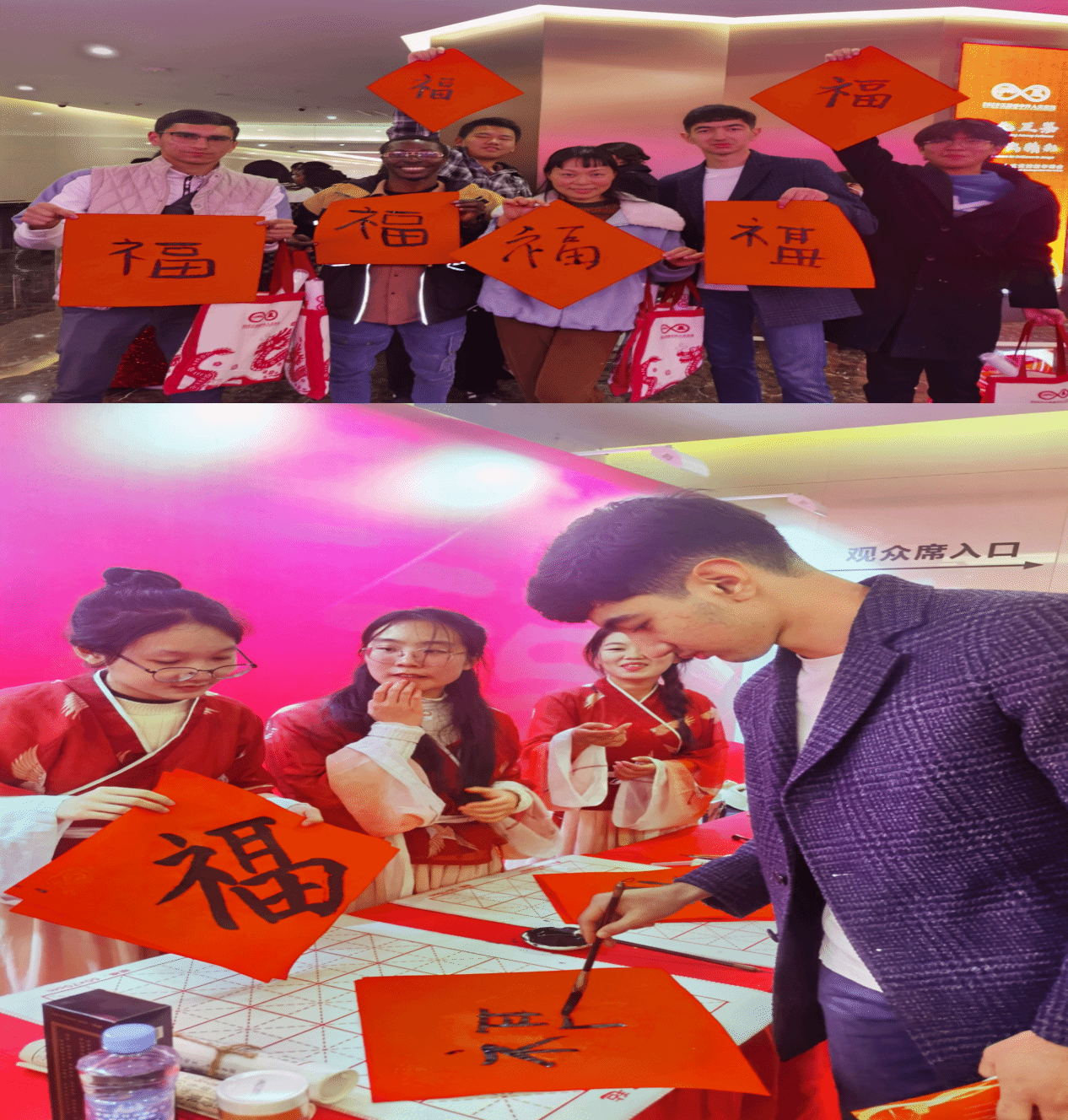 晚会期间,我校中外学生在体验书法、拆盲盒等活动环节中互相沟通,增加对中国传统文化的了解。多元的文化舞蹈和优美的旋律,给大家带来了不同的视听享受。留学生们表示,亲身体验新年活动,收获了中国朋友的友谊,加深了对中国文化的理解和认同。