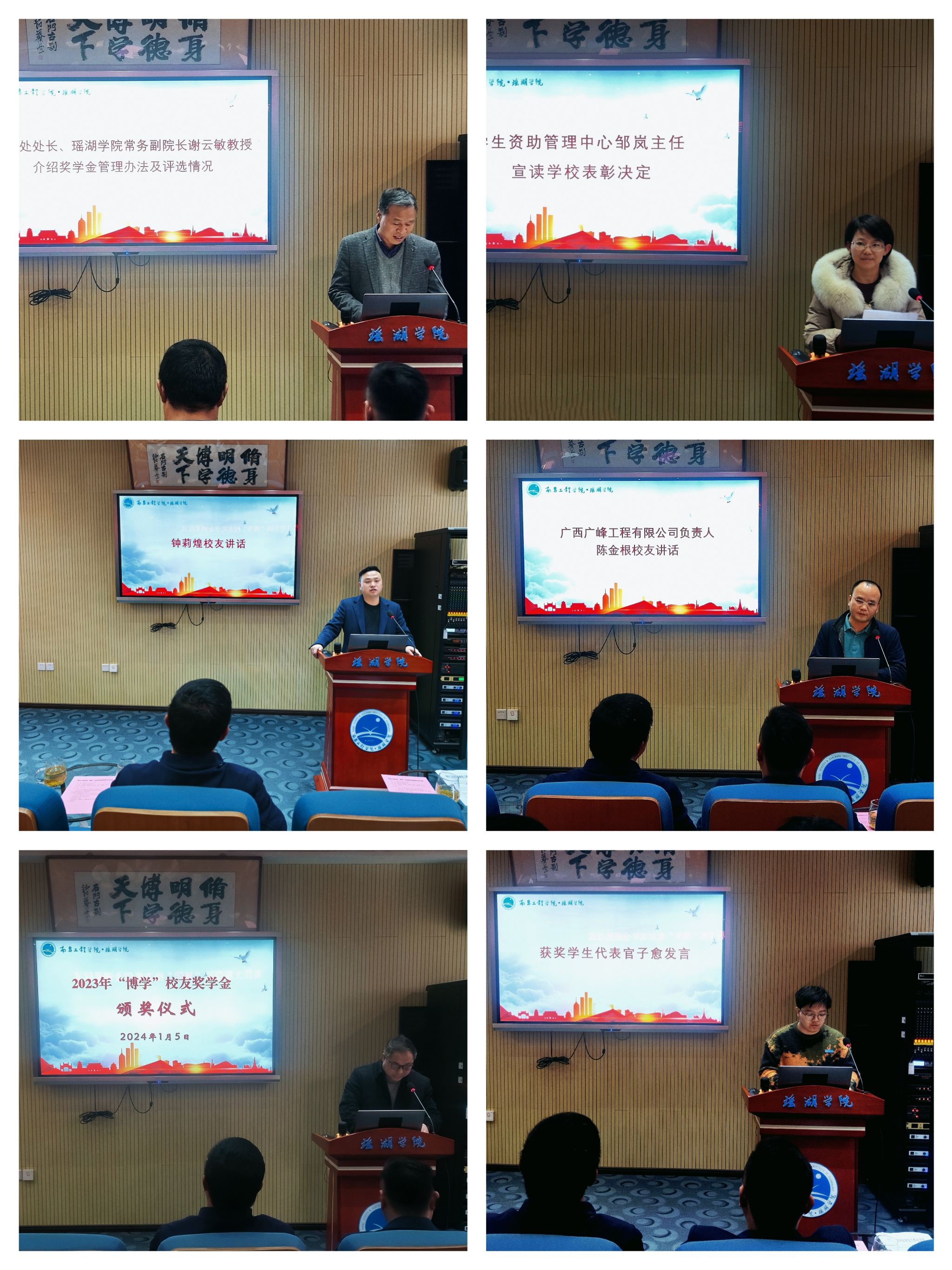 1月5日下午,我校“博学”校友奖学金颁奖仪式在瑶湖学院明德报告厅举行。副校长、瑶湖学院院长陆伟锋教授出席颁奖仪式并讲话,教务处、学生资助管理中心、瑶湖学院相关负责人,“博学”校友奖学金发起者、2004级水土保持与荒漠化防治专业校友、广西广峰工程有限公司负责人、广西校友会秘书长陈金根,2004级水土保持与荒漠化防治专业校友、宁波中流集团有限公司董事长钟莉煌及瑶湖学院师生代表参加。