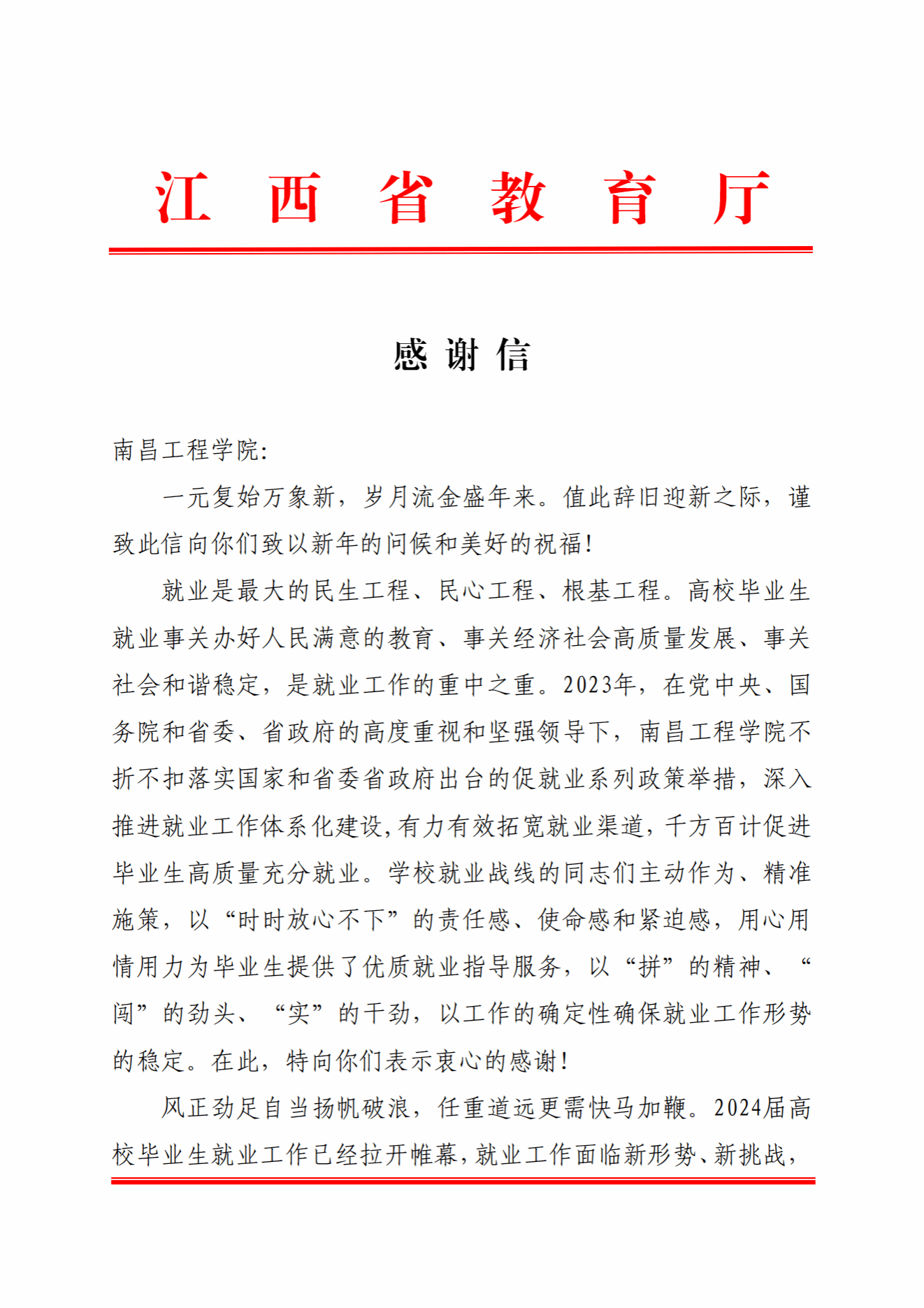 近日,江西省教育厅向我校致感谢信,对学校党委和行政不折不扣落实国家和省委、省政府出台的促就业系列政策举措,深入推进就业工作体系化建设,有力有效拓宽就业渠道,千方百计促进毕业生高质量充分就业表示感谢!