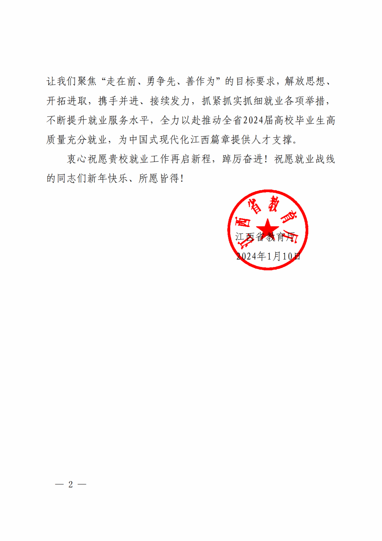 省教育厅希望学校聚焦“走在前、勇争先、善作为”的目标要求,解放思想、开拓进取,携手并进、接续发力,抓紧抓实抓细就业各项举措,不断提升就业服务水平,全力以赴推动全省2024届高校毕业生高质量充分就业,并祝愿学校就业战线的同志们新年快乐、所愿皆得。