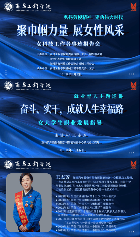 3月5日下午,我校举行“聚巾帼力量 展女性风采”女科技工作者事迹报告会暨“就业育人主题巡讲”活动,进一步弘扬劳模精神、劳动精神,激励广大女性建功新时代。全国巾帼建功标兵、全国五一巾帼标兵、南昌市三八红旗手、江铃汽车股份有限公司智能装备中心模具总工程师王志芳作宣讲。企业、学校师生代表共150余人参加。