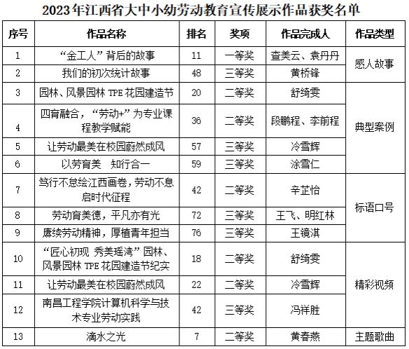 近日,江西省教育厅公布了2023年全省大中小幼劳动教育宣传展示作品获奖结果,我校在劳动教育典型案例、标语口号、感人故事、精彩视频、主题歌曲等项目评选中共有13项作品获奖,其中一等奖1项、二等奖6项,三等奖6项。