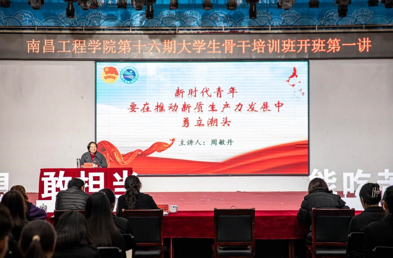 周敏丹对第十五期大学生骨干培训班学员带来的成果展示表示肯定,为第十六期大学生骨干培训班学员代表授旗,并以《新时代青年要在推动新质生产力发展中勇立潮头》为题,为第十六期大学生骨干培训班授课。她从什么是新质生产力,江西在高质量发展中如何因地制宜推动发展新质生产力,新时代中国青年应在推动新质生产力发展中大有作为,南工青年如何在历史洪流中勇立潮头等方面进行阐述,并对第十六期大骨班学员提出希望:要坚定理想信念,争做强国有我的担当者和甘于奉献的建设者;要不断提升学习力,养成终身学习的习惯,成为新型思维模式的创造者;要提高思考问题的能力,争做思想活跃的创新者;要坚持自己的专业兴趣和热爱,保持奋勇向前的动力。