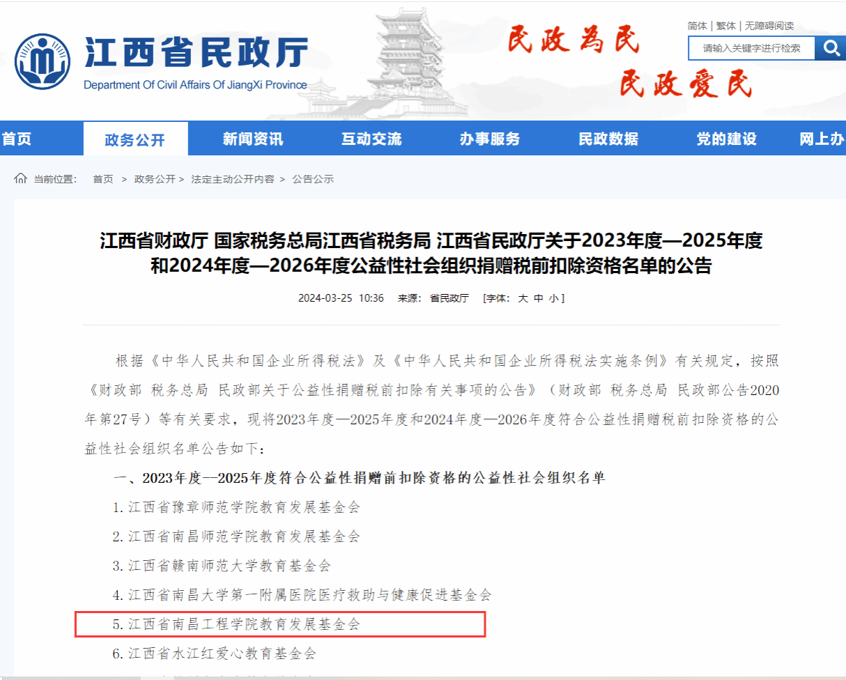 近日,江西省财政厅、国家税务总局江西省税务局和江西省民政厅联合公布2023年度-2025年度和2024年度-2026年度公益性社会组织捐赠税前扣除资格认定名单。我校教育发展基金会获得2023年度-2025年度公益性捐赠税前扣除资格。