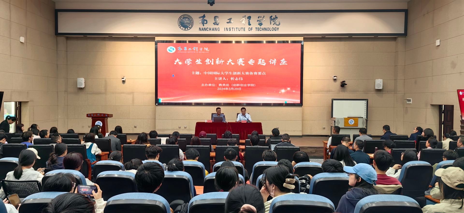 3月29日,我校大学生创新大赛专题讲座在教学北大楼C105举行,大学生创新大赛国赛评委、宁波乾祥天检测技术有限公司董事长忻志伟作题为“中国国际大学生创新大赛备赛要点”的专题讲座。副校长陆伟锋主持,师生代表200余人参加。
