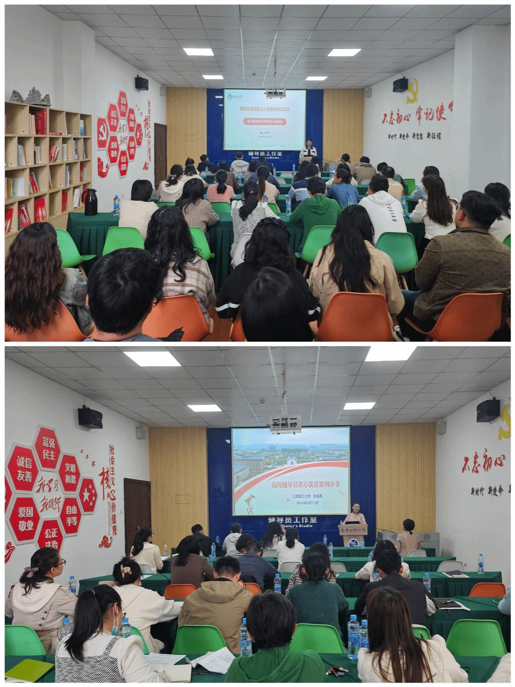 4月11日下午,江西省辅导员素质能力大赛一等奖获得者、南昌大学江西省最美辅导员谭潭和江西理工大学辅导员张海燕来校作“辅导员素质能力大赛备赛分享和真题演练”专题讲座,学生工作部(处)、学院党委(党总支)学生工作负责人、本届校级参赛辅导员共60余人参加。