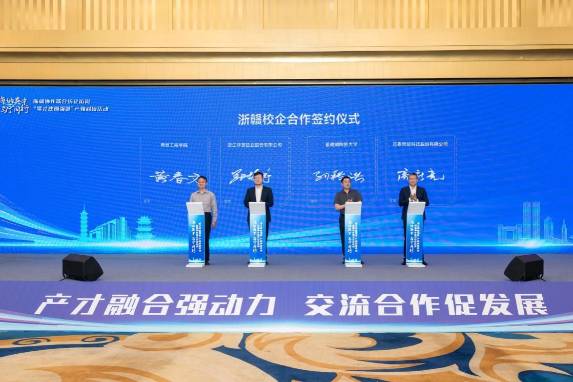 在浙赣协作联合访企拓岗产教对接活动暨“海纳英才与宁同行”——“聚才建圈强链”系列活动启动仪式上,周敏丹代表江西高校作交流发言,我校与华友钴业等校企代表签订合作协议,以合作共赢驱动产教深度融合。