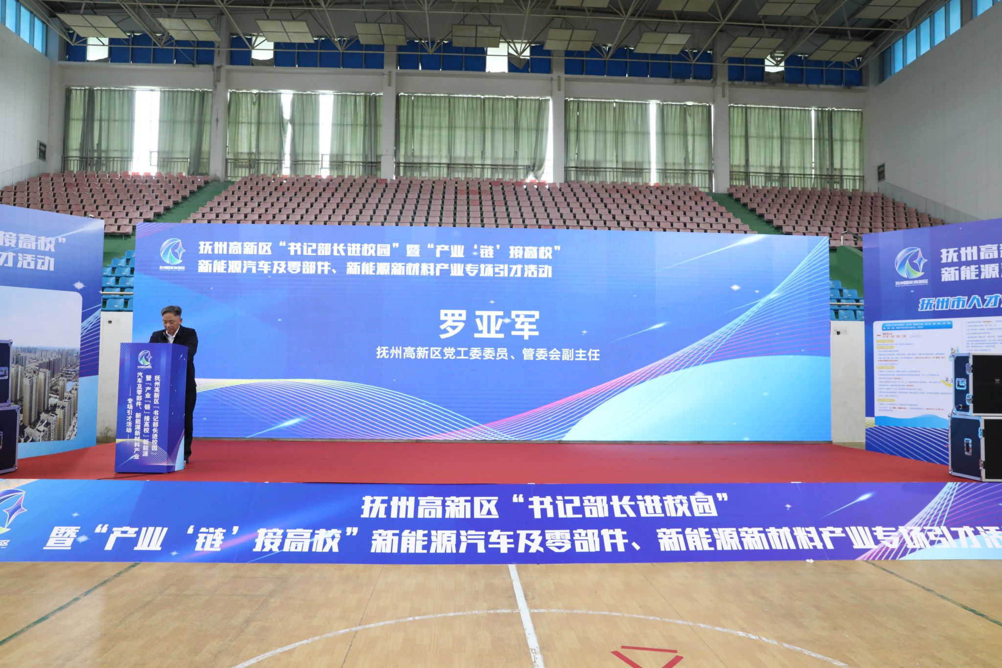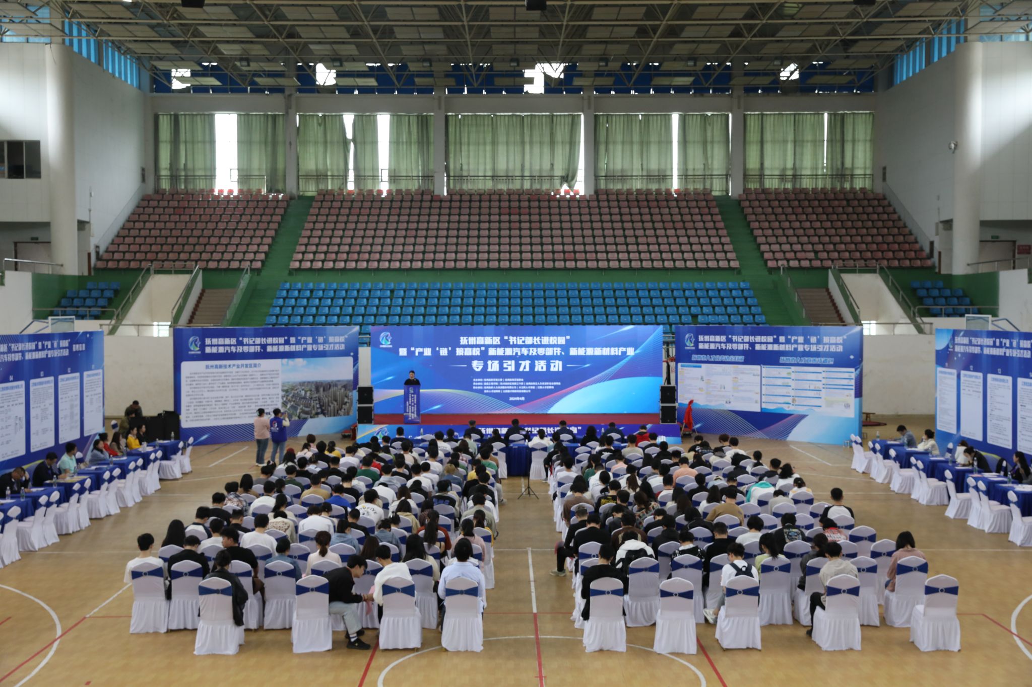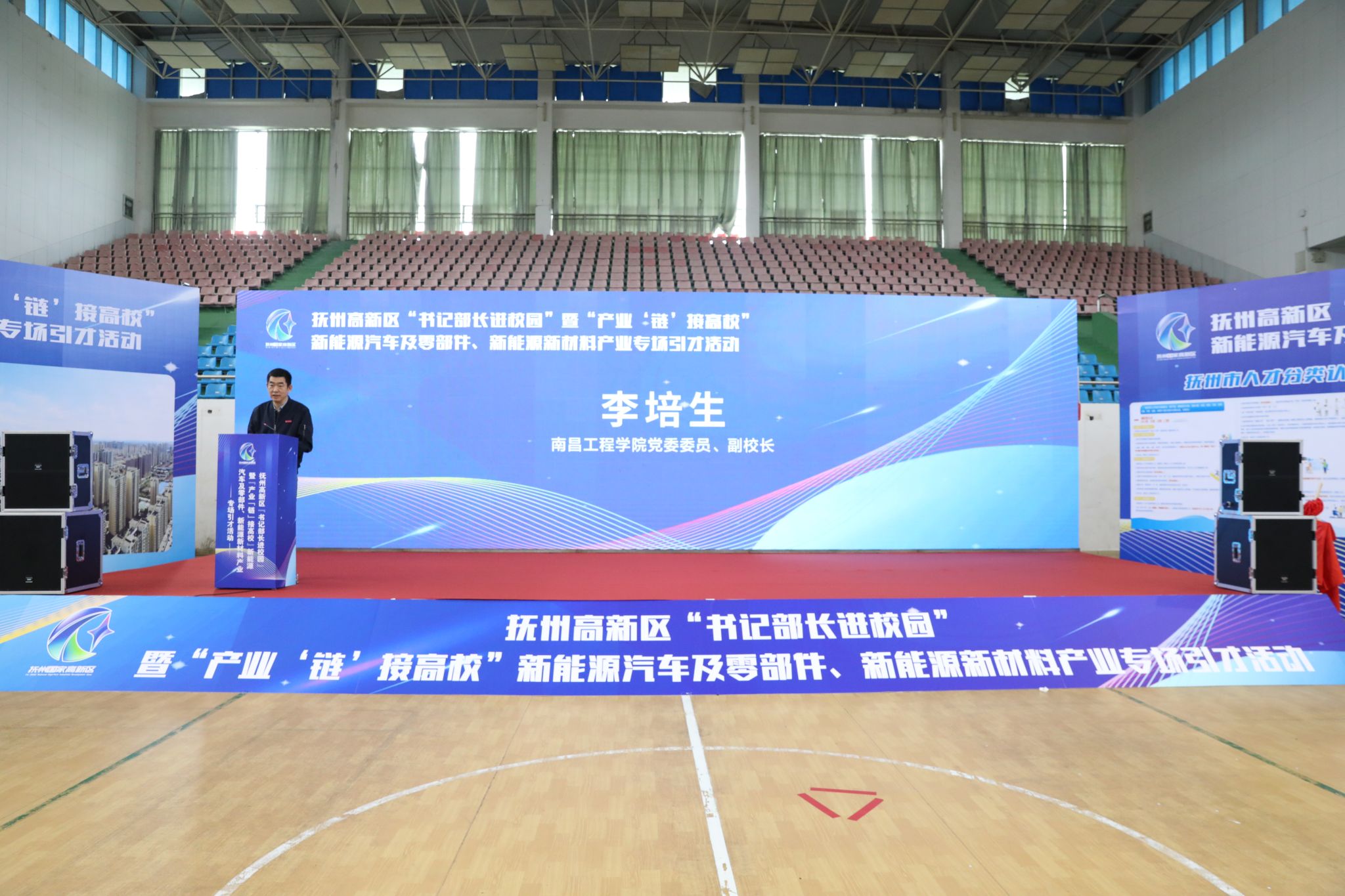 4月18日上午,2024年抚州高新区“书记部长进校园”暨“产业‘链’接高校”新能源汽车及零部件、新能源新材料产业专场引才活动在我校体育馆举行。副校长李培生,抚州高新区党工委委员、管委会副主任罗亚军出席。招生就业处、机械工程学院、电气工程学院、信息工程学院、工商管理学院等相关负责人,抚州市高新区有关单位负责人,用人单位代表,学校师生代表等共200余人参加。