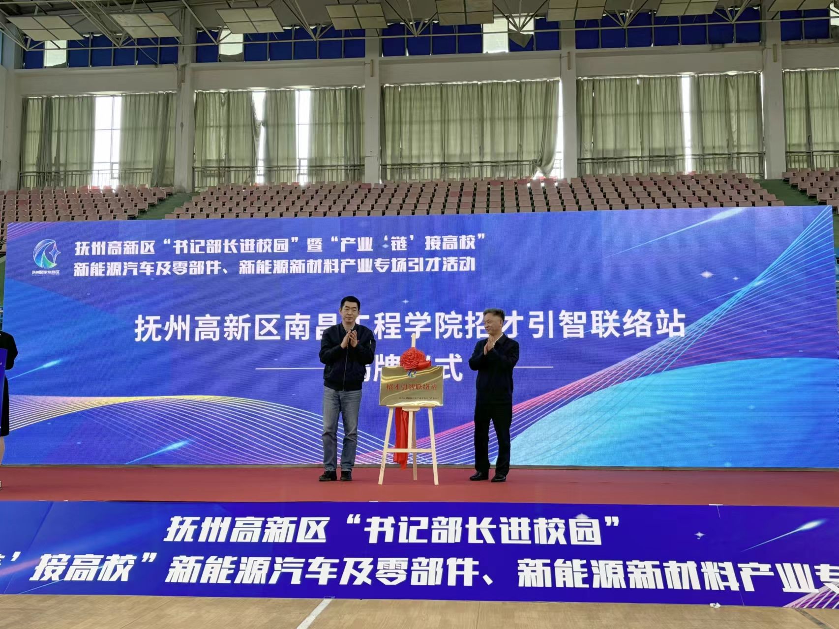 启动仪式现场,政校双方领导共同为“招才引智联络站”揭牌。抚州高新区人社局负责人、江西铜博科技股份有限公司和江西省锐美电驱动系统有限公司人资负责人进行了产业和企业情况介绍。