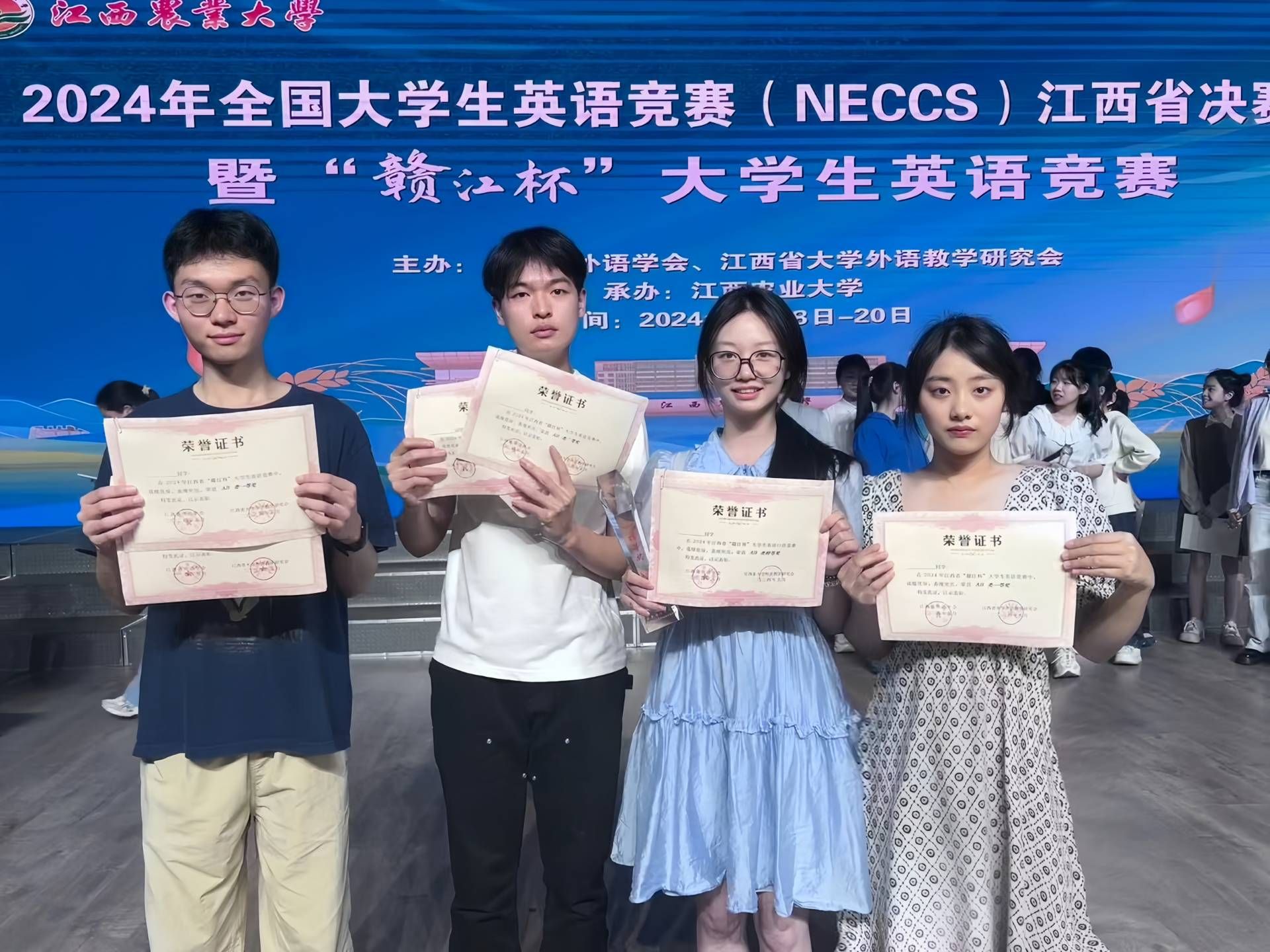 5月19日-20日,2024年全国大学生英语竞赛江西省决赛暨“赣江杯”大学生英语竞赛在江西农业大学举行,全省47所高校近千名学生参加。我校学子在大赛中取得优异成绩,其中2023级翻译专业硕士研究生孙嫘荣获AB类口语竞赛特等奖、综合竞赛二等奖,2022级英语专业许能超和辛芷怡分别荣获AB类综合竞赛一等奖,2022级英语专业刘凯祺荣获AB类综合竞赛二等奖。