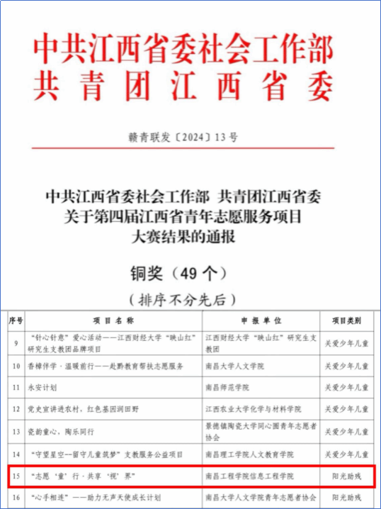 5月13日,第四届江西省青年志愿服务项目大赛暨志愿服务交流活动落下帷幕。经过初赛、项目展示、决赛路演和答辩等环节,我校选送的信息工程学院志愿服务项目《志愿“童”行·共享“视”界》项目荣获铜奖。