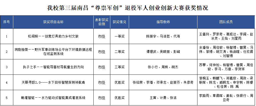 近日,我校5个项目在南昌市退役军人事务局主办的第三届南昌“尊祟军创”退役军人创业创新大赛中荣获佳绩,其中“松间照—创意灯具”荣获一等奖、“洞影烛微” 荣获二等奖、“执子之手—智能导盲杖” 荣获三等奖、“天眼寻踪”和“畅灌智驱” 荣获优胜奖。