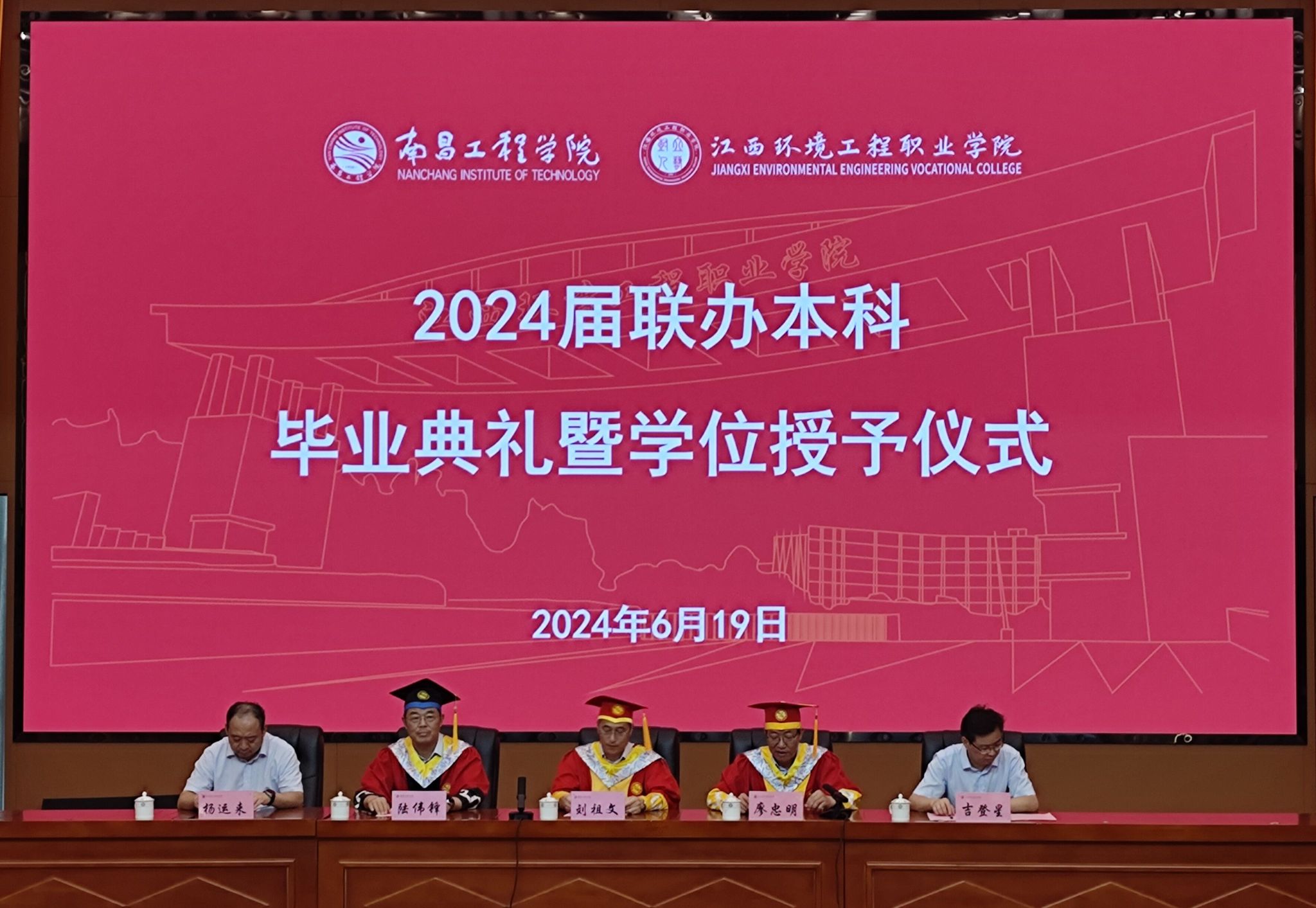 栀子花开,蝉鸣初夏。6月19日,我校与江西环境工程职业学院联合培养2024届本科生毕业典礼暨学士学位授予仪式在江西环境工程职业学院图书馆一楼多功能厅举行。校长刘祖文出席并为2024届联合培养本科毕业生拨穗正冠,颁发学士学位证书,江西环境工程职业学院校长廖忠明出席并主持典礼,我校副校长陆伟锋和江西环境工程职业学院副校长吉登星出席。