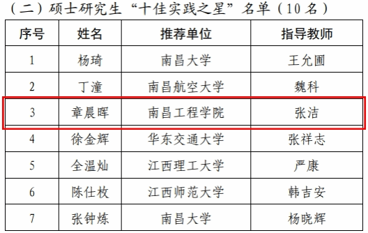 近日,江西省教育厅《关于公布2024年江西省研究生“十佳学术之星”“十佳实践之星”评选结果的通知》发布。我校2022级水利工程专业研究生章晨晖荣获2024年江西省硕士研究生“十佳实践之星”。