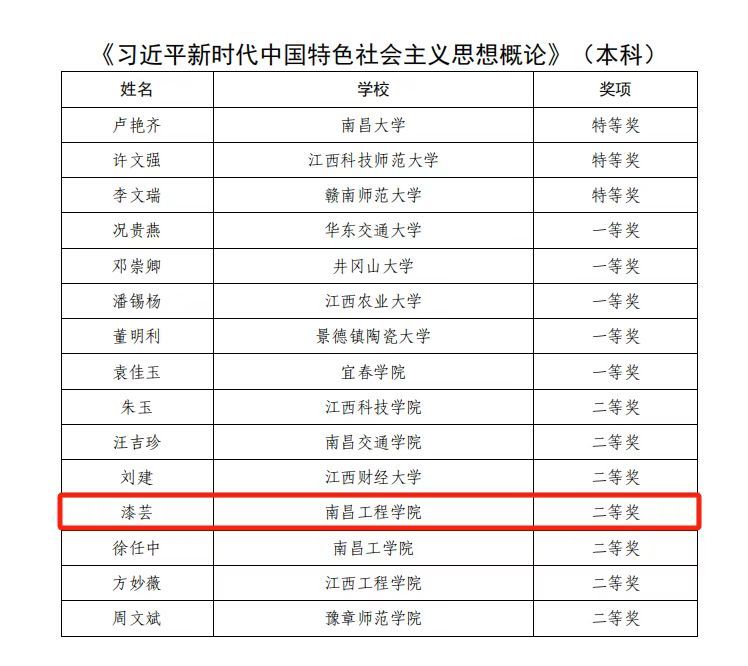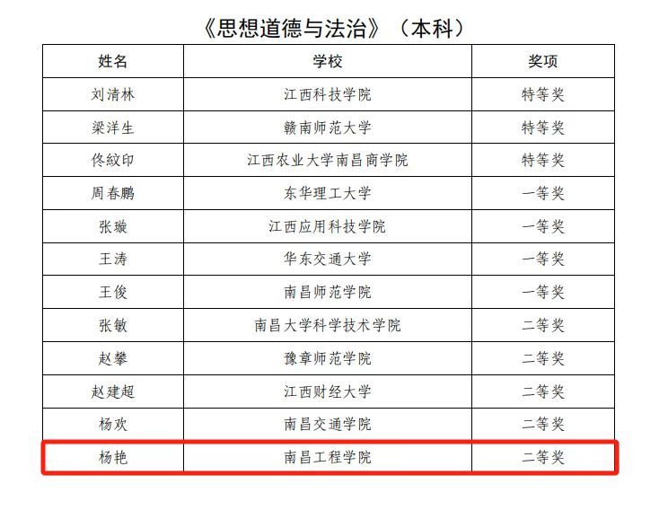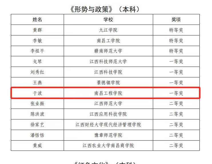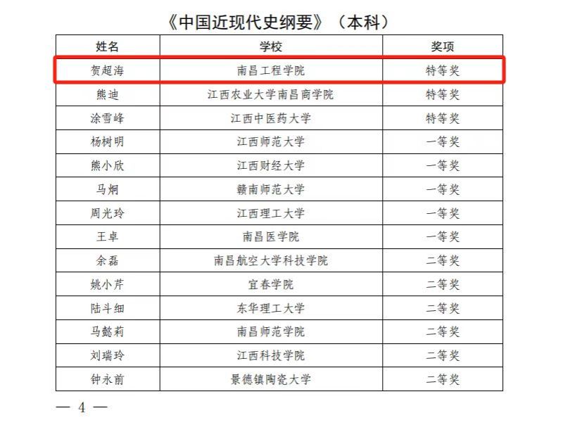近日,江西省教育厅印发了《关于公布2024年度全省高校思政课和红色文化课程教学比赛结果的通知》,我校思政课教师在激烈角逐中斩获4项佳绩,其中,贺超海荣获《中国近现代史纲要》课程比赛(本科组)特等奖,于波荣获《形势与政策》课程比赛(本科组)一等奖,漆芸荣获《习近平新时代中国特色社会主义思想概论》课程比赛(本科组)二等奖,杨艳荣获《思想道德与法治》课程比赛(本科组)二等奖。