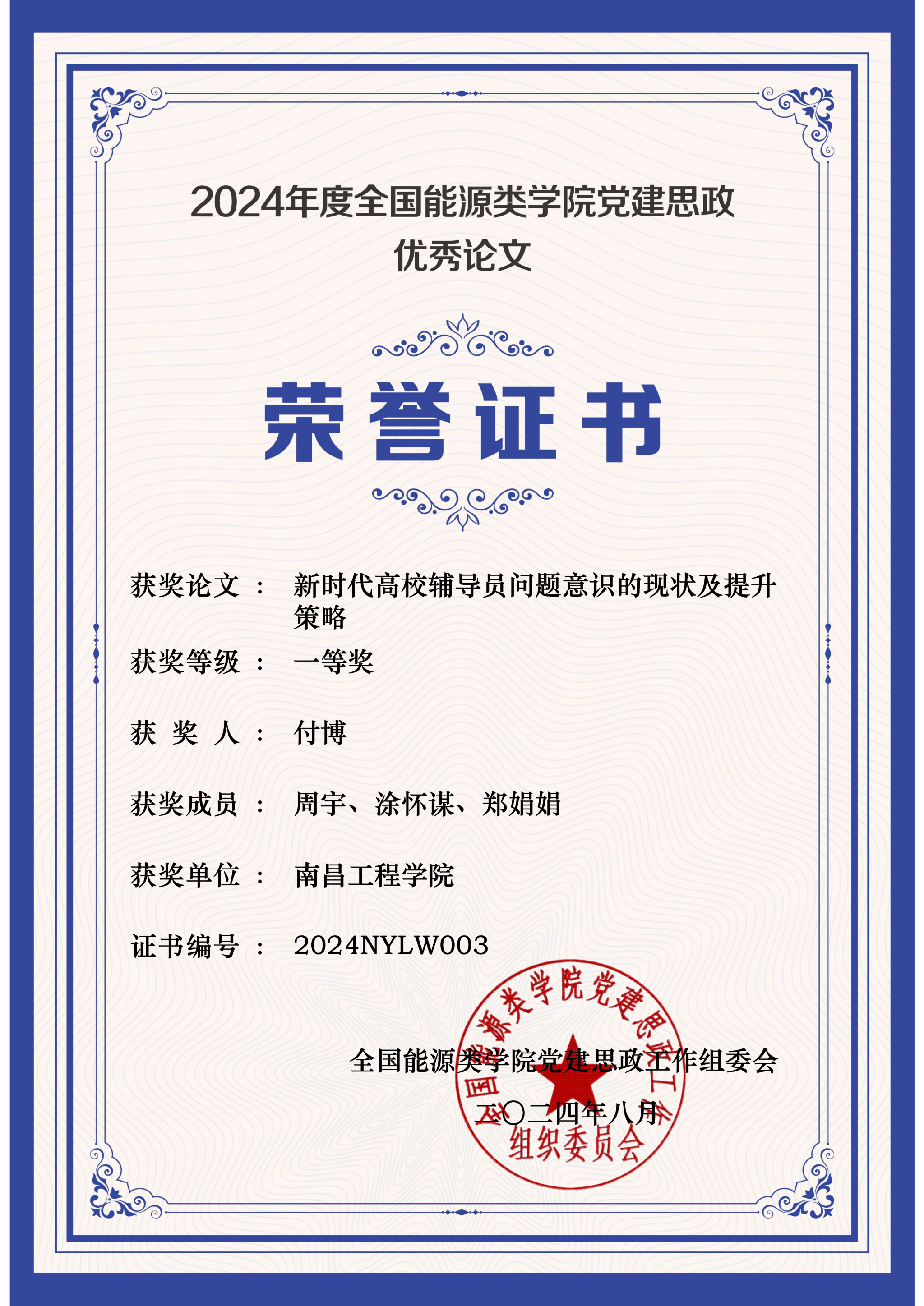 近日,2024年度全国能源类学院党建思政优秀论文评选结果揭晓,我校电气工程学院付博团队申报的论文《新时代高校辅导员问题意识的现状及提升策略》荣获思政论文一等奖。