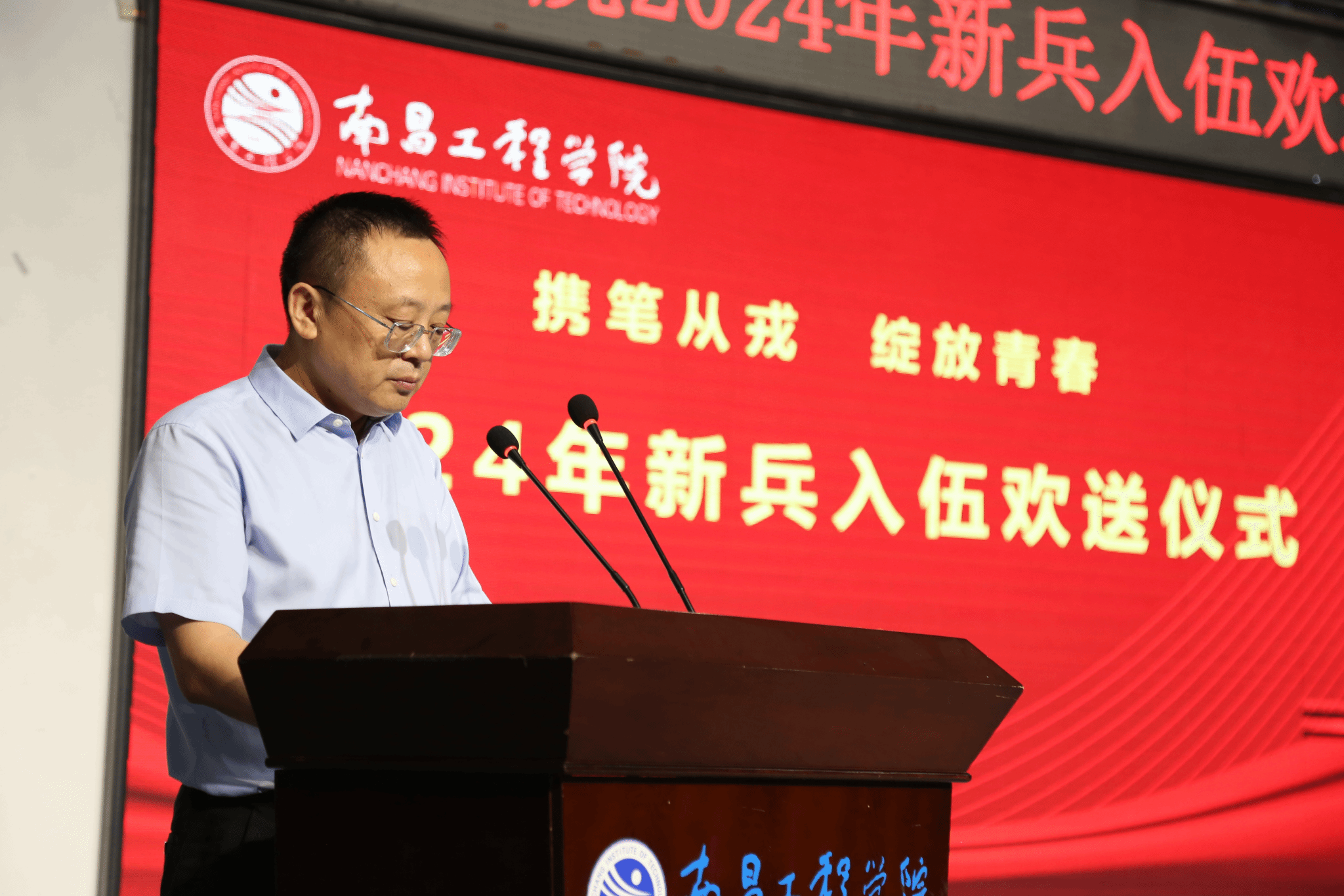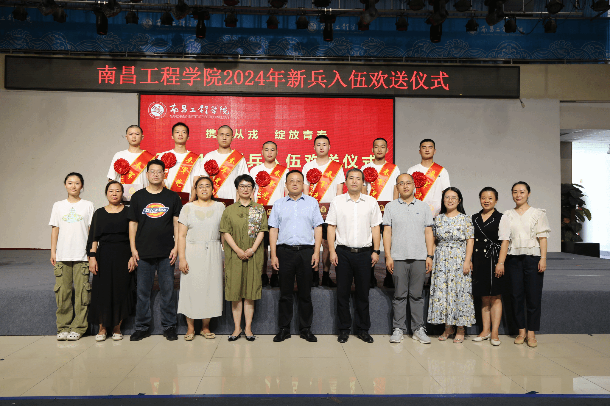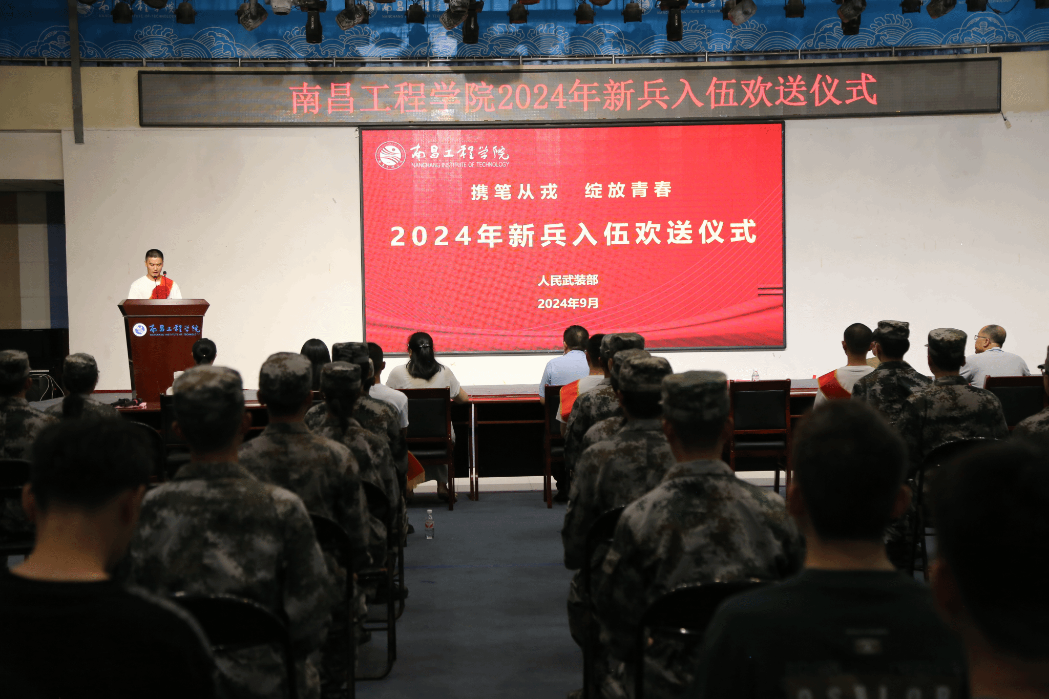 9月5日,我校2024年新兵入伍欢送仪式在新时代文明实践中心(大学生活动中心)多功能厅举行。校人民武装部征兵工作人员,各学院征兵工作负责人,大学生国防教育协会、军训教官队及部分2025届毕业生参加。校党委委员熊涛出席并讲话。