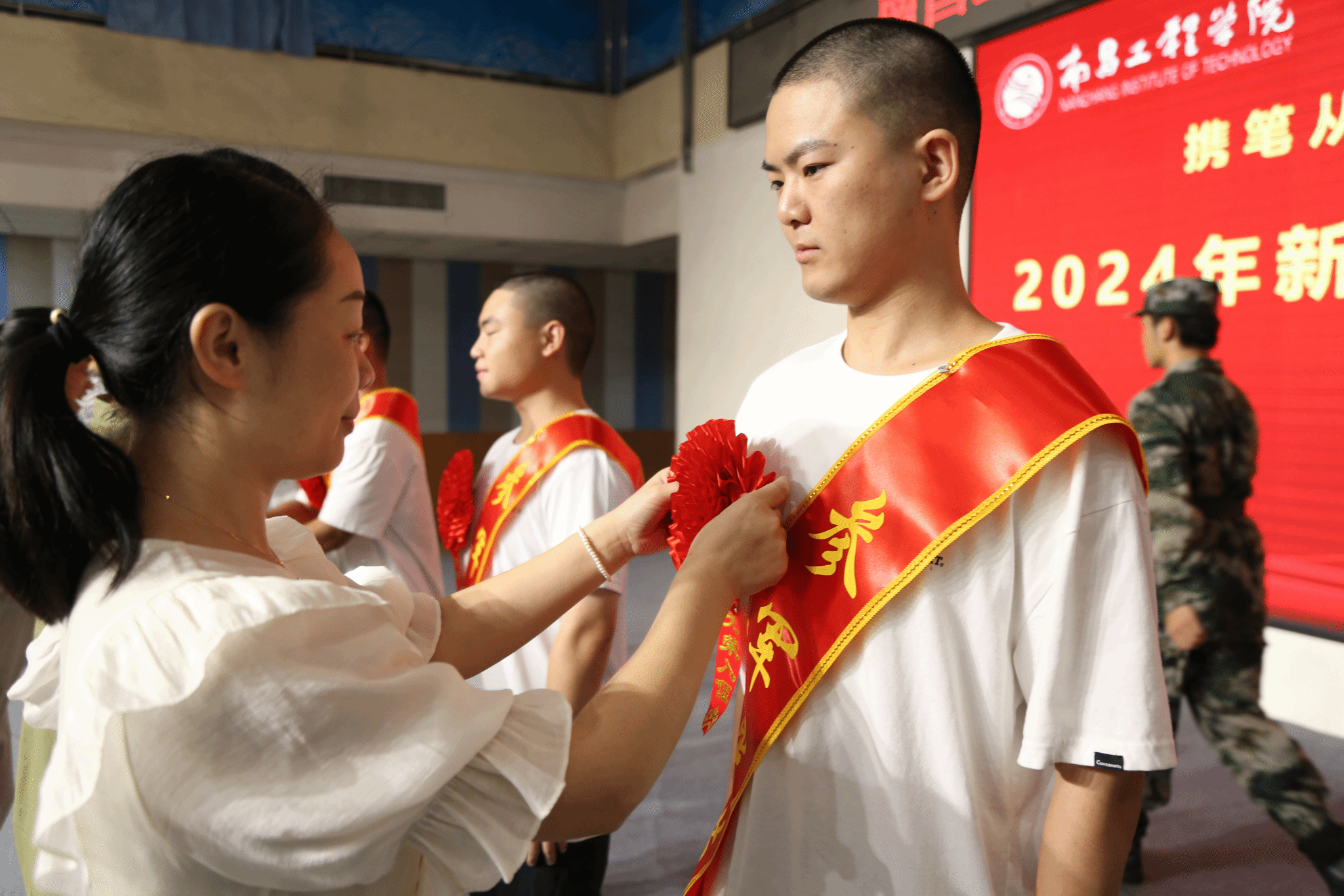 各学院征兵工作负责人为入伍学生佩戴红花,赠送纪念品,送上殷切关怀和诚挚祝福。(文/图 李道淦 责任编辑 潘旭 罗婷)