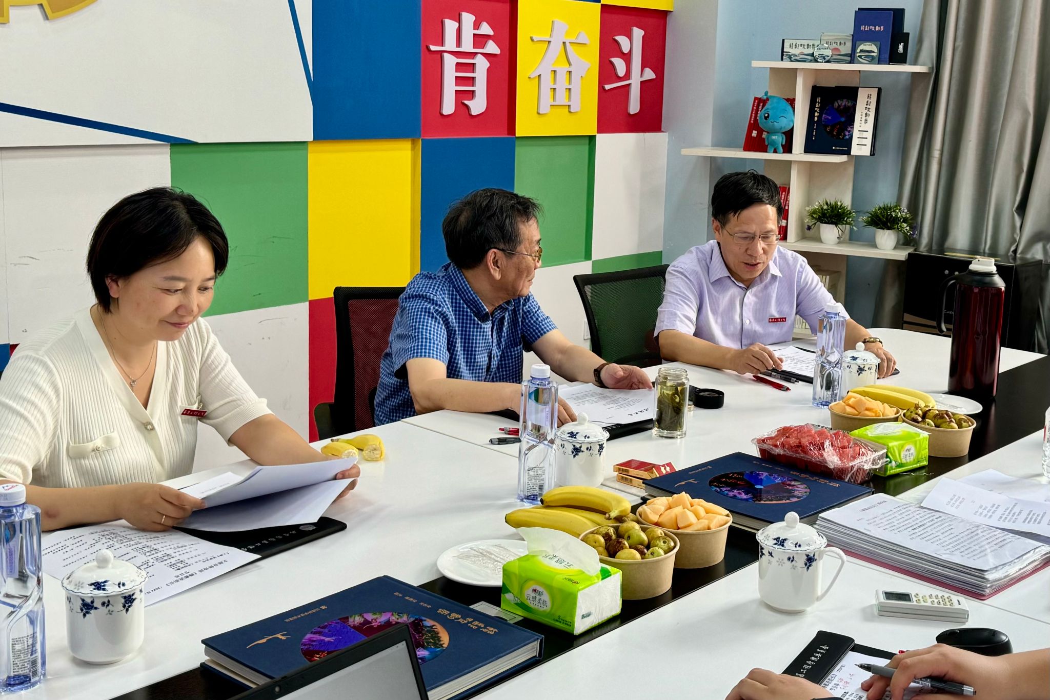 在大学生活动中心青年之家,汪胜前与《赣鄱流韵长》总编导秦庚云亲切会面,了解演出筹备情况,审议全新节目《川流不息》《鄱湖咏叹》《因你而美丽》,对下一步如何做好水文化教育提出具体要求。