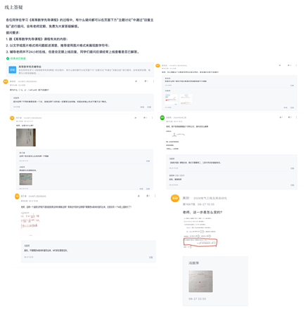 《高等数学先导课》设置了11个章节,每个章节3—8个视频,总计47个5—15分钟的教学视频组成。每个章节学完之后,将会有一个网上测试,学生可自行检测学习成果。课程平台上还有专门的讨论区供学生提问,自开课以来,老师每天都会安排时间进行答疑,老师答疑区的发帖数量已经多达2023条,每位同学提出的问题都会收到回复,课程已超百万人次登录。课程结束后的学生线上考试成绩,将作为高等数学任课教师们开学后为学生提供更有针对性教学的依据。