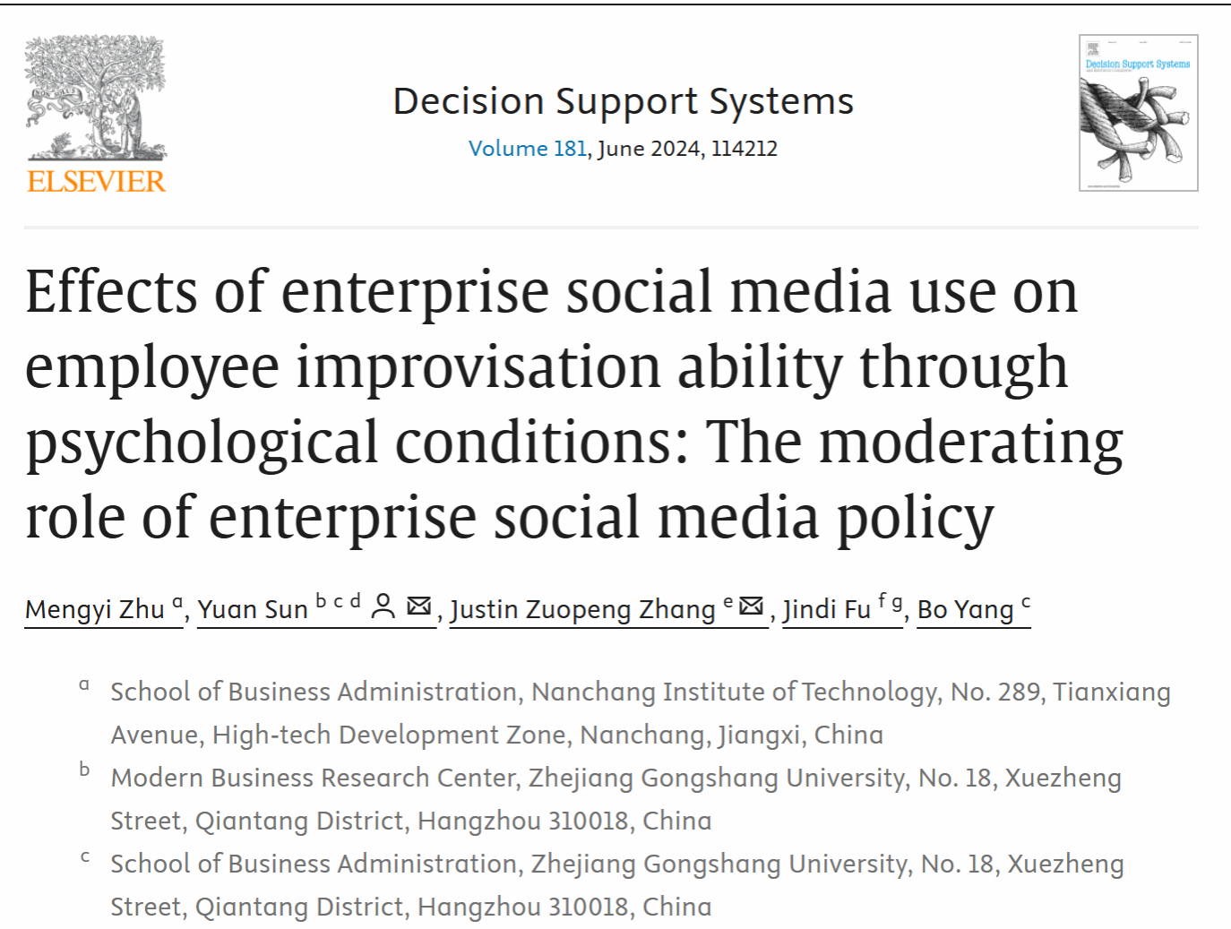 近日,我校工商管理学院青年教师祝梦忆博士在《Decision Support Systems》发表文章“Effects of enterprise social media use on employee improvisation ability through psychological conditions: The moderating role of enterprise social media policy”。