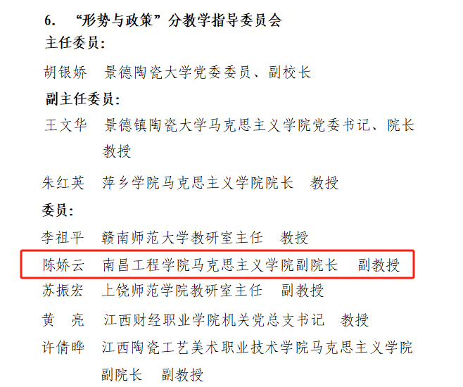 近日,江西省委教育工委、江西省教育厅印发了《关于成立2024—2028年江西省高校思想政治理论课教学指导委员会的通知》,我校马克思主义学院许金华老师入选“毛泽东思想和中国特色社会主义理论体系概论”分教学指导委员会副主任委员,陈娇云老师入选“形势与政策”分教学指导委员会委员。