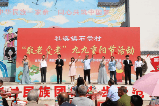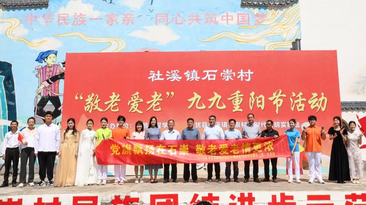 重阳佳节,爱洒金秋。10月10日上午,我校定点帮扶村石崇村“敬老爱老”九九重阳节活动在该村民族团结进步示范广场举行,进一步弘扬尊老、敬老的中华民族传统美德,丰富老年人的精神文化需求,让辖区老人们度过一个欢乐、祥和的重阳节。校驻村工作队,人文与艺术学院师生党员、入党积极分子和团员青年代表来到活动现场联合社溪镇、石崇村干部一同举办以“党旗飘扬在石崇,敬老爱老情更浓”为主题的党(团)日活动,为当地老年人送去精彩的文艺节目和美好的节日祝福。