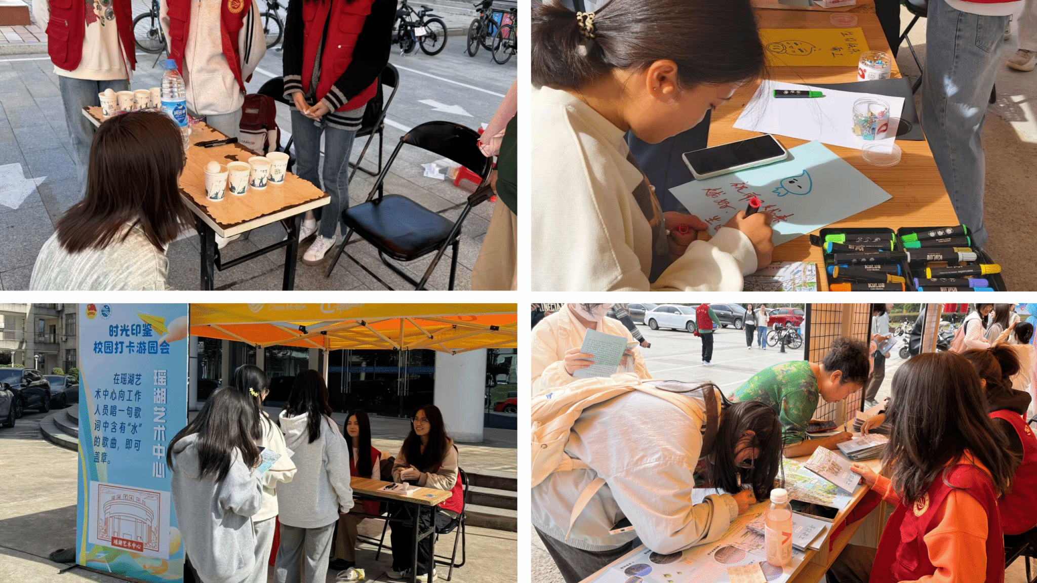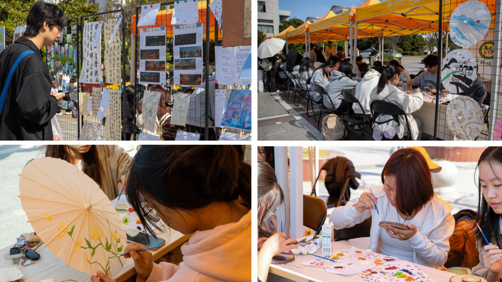 社团团工委在润园食堂门口开展“南工印记·社团活动文化展”书画、摄影、诗词展览,全面展示了丰富多彩的社团文化成果,充分彰显了社团文化的多元性与活力,营造了浓厚校园氛围,为校园文化建设注入了新的生机与动力。书画社、绿协等社团将现场制作扇面及油纸伞赠予到场参与的师生、校友。