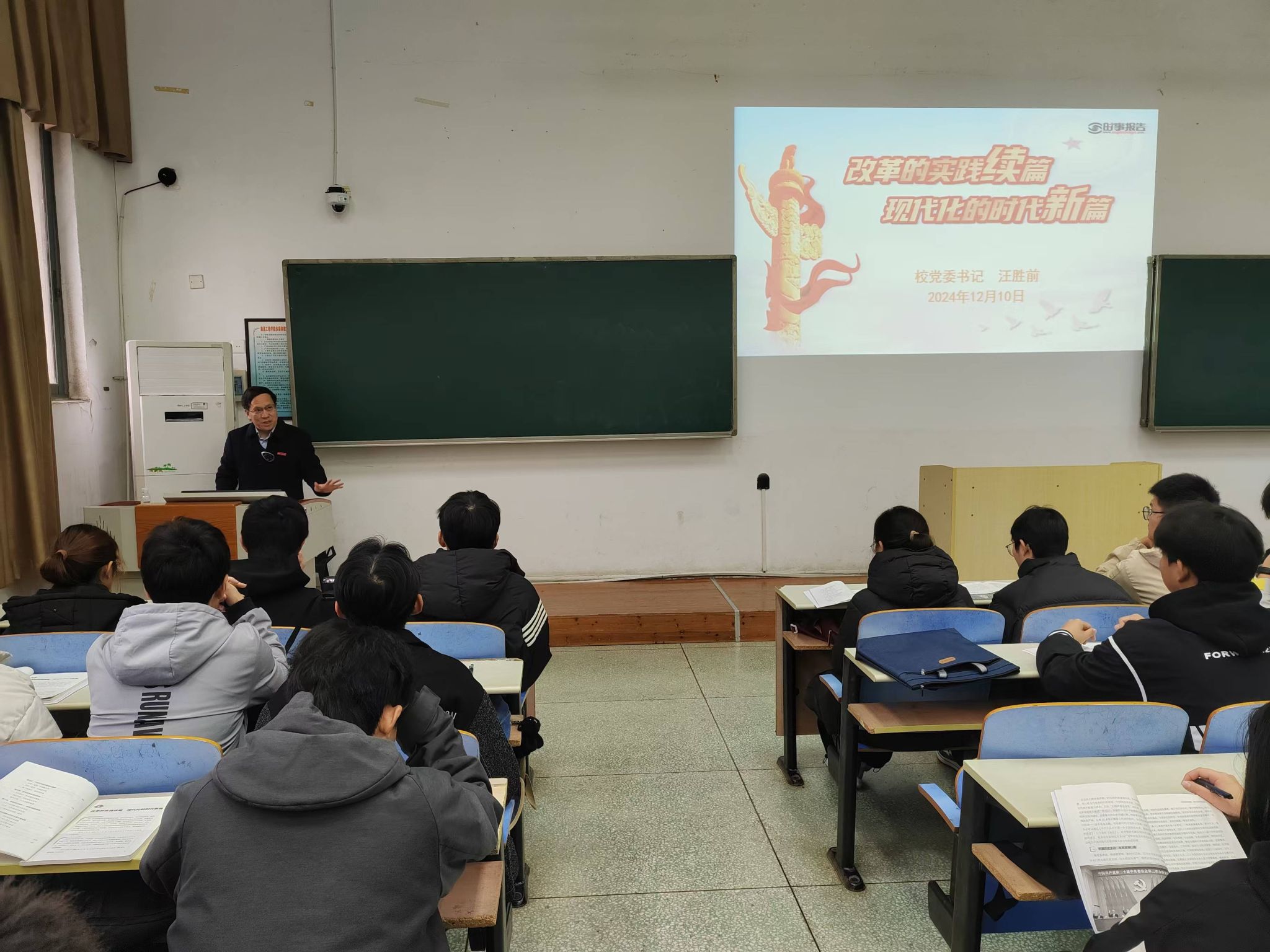 12月10日,校党委书记汪胜前以“改革的实践续篇 现代化的时代新篇”为题,为2024级应急管理和人力资源管理专业的同学们上了一堂《形势与政策》课。