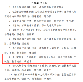 近日,江西省文明办等部门联合发布《关于“颂家风 传美德 耀赣鄱”活动获奖作品情况的通报》,由我校选送的绘画作品《家风绘影·赣鄱情深》(作者:赵文敏,指导老师:张淑华)荣获大学组二等奖,家风故事作品《小家风景·大家愿景·国家前景》(作者:王诚德,指导老师:胡盛华)荣获大学组三等奖。