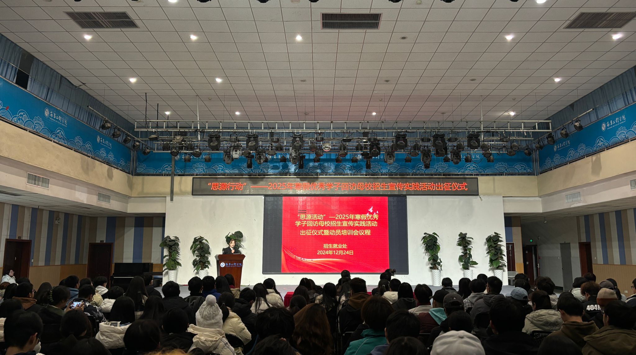 12月24日晚,“思源行动”2025年寒假回访母校招生宣传实践活动出征仪式暨动员培训会在新时代文明实践中心(大学生活动中心)多功能厅举行。招生就业处负责人和相关招生工作人员,往届优秀回访团队学生代表以及2025年寒假回访高中母校活动全体同学参加。