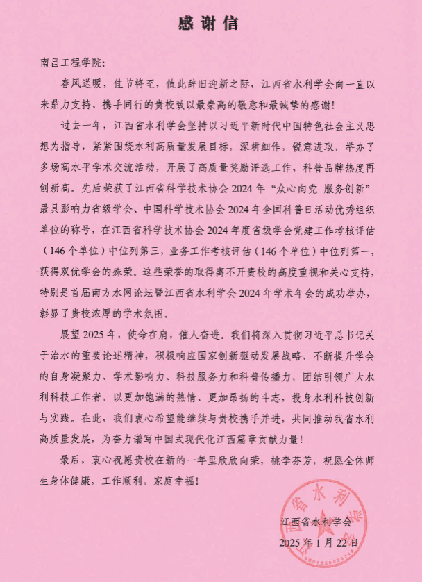近日,江西省水利学会向我校致感谢信,对我校长期以来的鼎力支持和携手同行表达诚挚谢意,对双方未来的合作充满期待。
