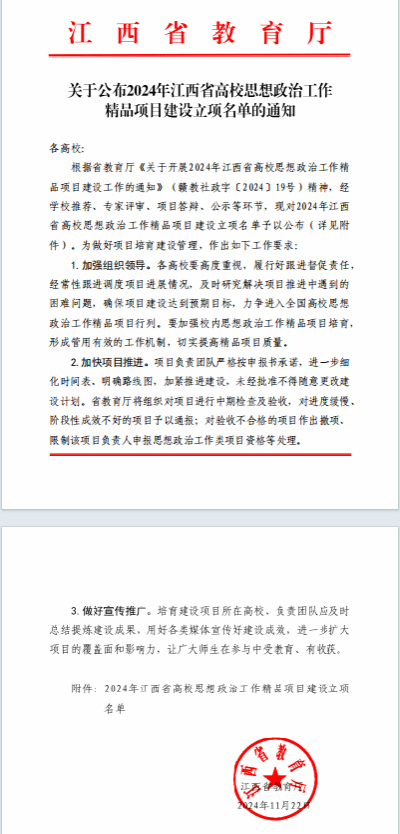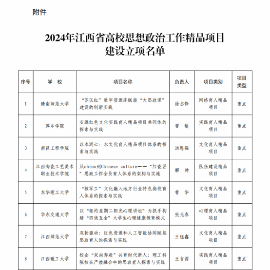 近日,江西省教育厅公布2024年江西省高校思想政治工作精品项目建设立项名单,我校水文化育人项目《以水润心:水文化育人精品项目体系的探索与实践》获立项(文化育人精品项目重点项目)。
