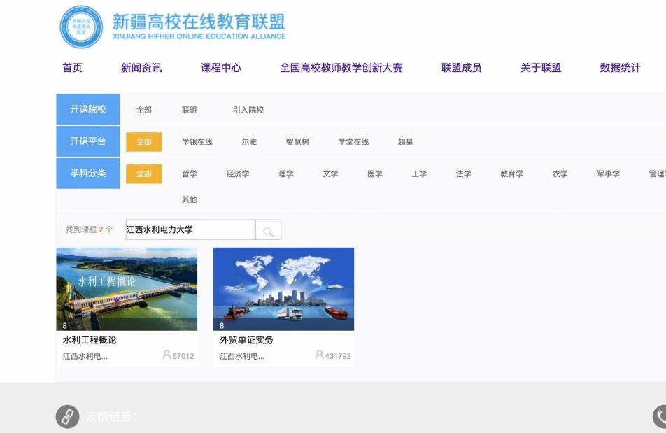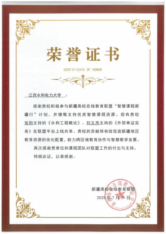 近日,新疆高校在线教育联盟发布《关于公布第一批“智慧课程新疆行”精品智慧课程遴选上线新疆高校在线教育联盟平台结果的通知》,我校《水利工程概论》《外贸单证实务》两门线上课程成功入选第一批“智慧课程新疆行”项目,正式上线新疆高校在线教育联盟平台。