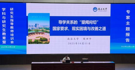 南昌大学卓越工程师学院党委书记、党委研工部常务副部长陈世中教授作“研究生导学关系构建”专题报告。他从导学关系的内涵与价值出发,结合丰富的工作案例,分析了当前导学关系面临的挑战,并分享了构建和谐、高效、共进导学关系的实践方法与长效机制,为我校提升导师育人能力、优化研究生培养环境提供了启示。