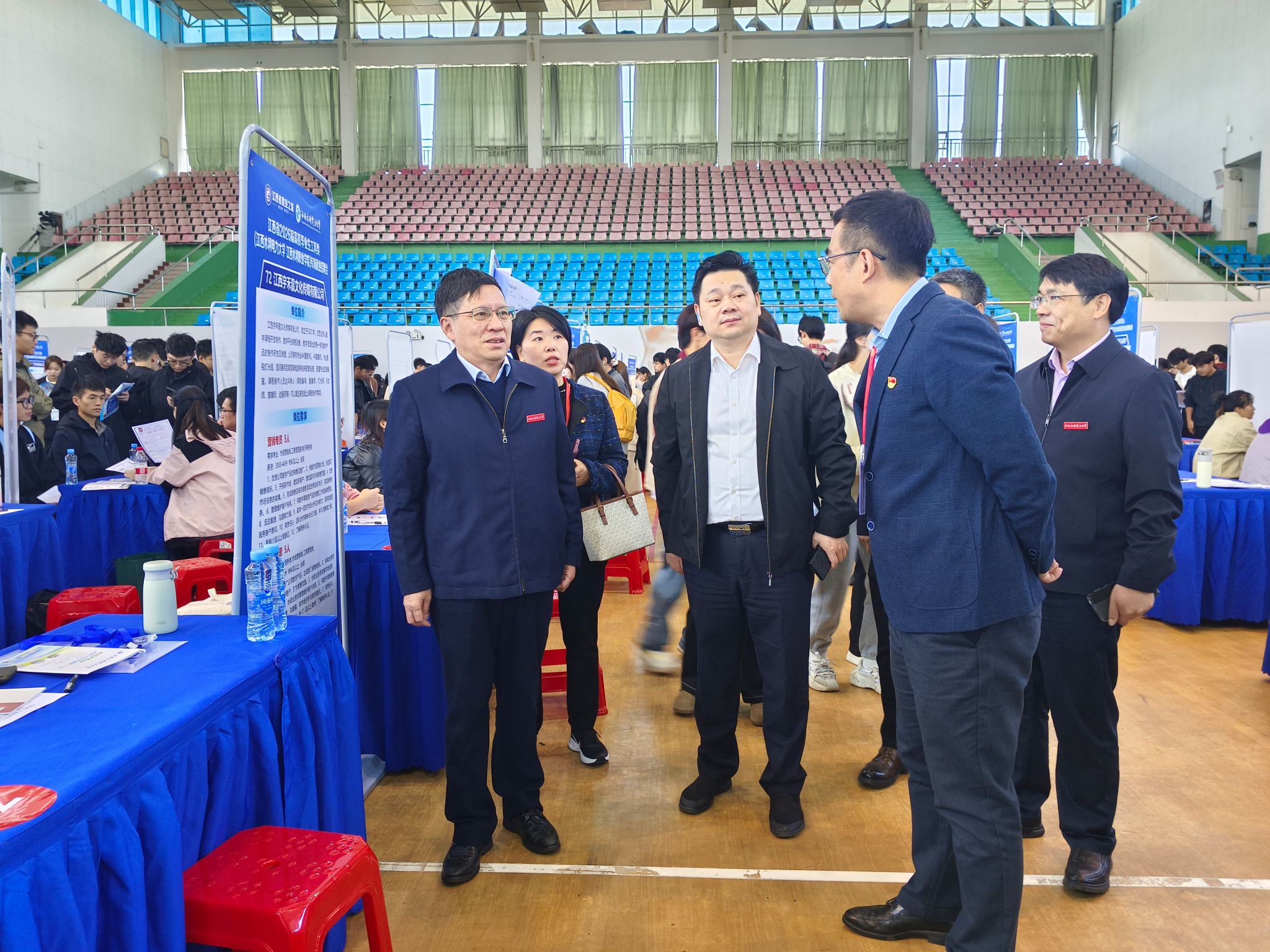 校党委书记汪胜前、副校长周仲魁,省就业创业服务中心党委委员、副主任史学义,江西省人才发展集团党委委员、副总经理姚爱民来到招聘会现场指导工作。学校招生就业处负责人陪同相关人员深入招聘会各功能区域,详细询问活动组织筹备进展、企业参展规模、岗位需求结构以及毕业生求职意向等情况。