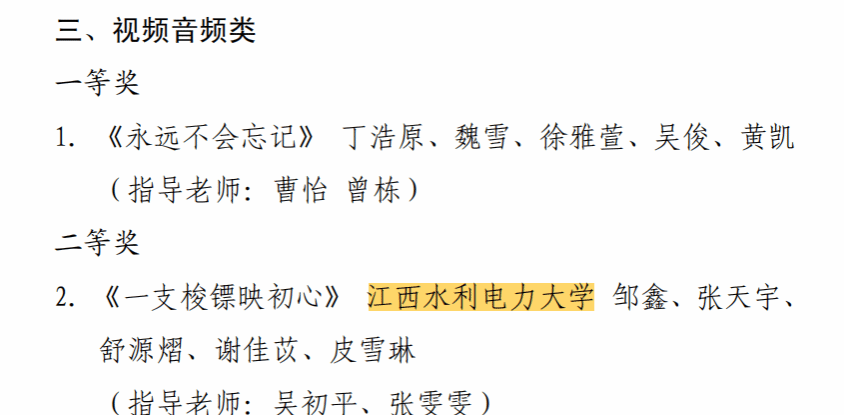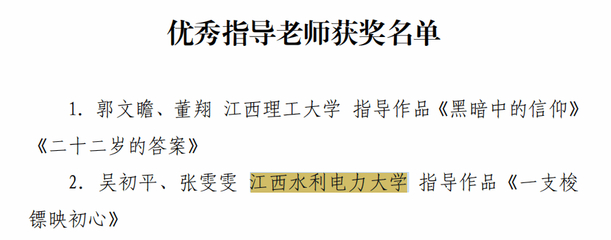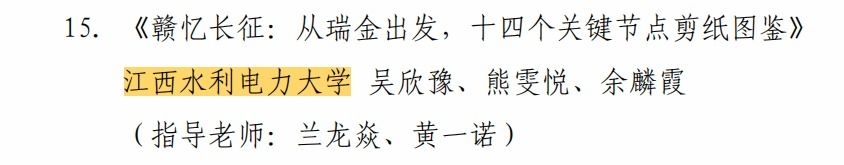 其中,由吴初平、张雯雯老师指导,2023级工科实验1班邹鑫等同学创作的视频音频作品《一支梭镖映初心》荣获二等奖;由兰龙焱、黄一诺老师指导,2022级数字媒体艺术专业吴欣豫等同学创作的《赣忆长征:从瑞金出发,十四个关键节点剪纸图鉴》获得文创产品类优秀奖。我校被授予“优秀组织奖”,吴初平、张雯雯两位老师荣获“优秀指导老师奖”。