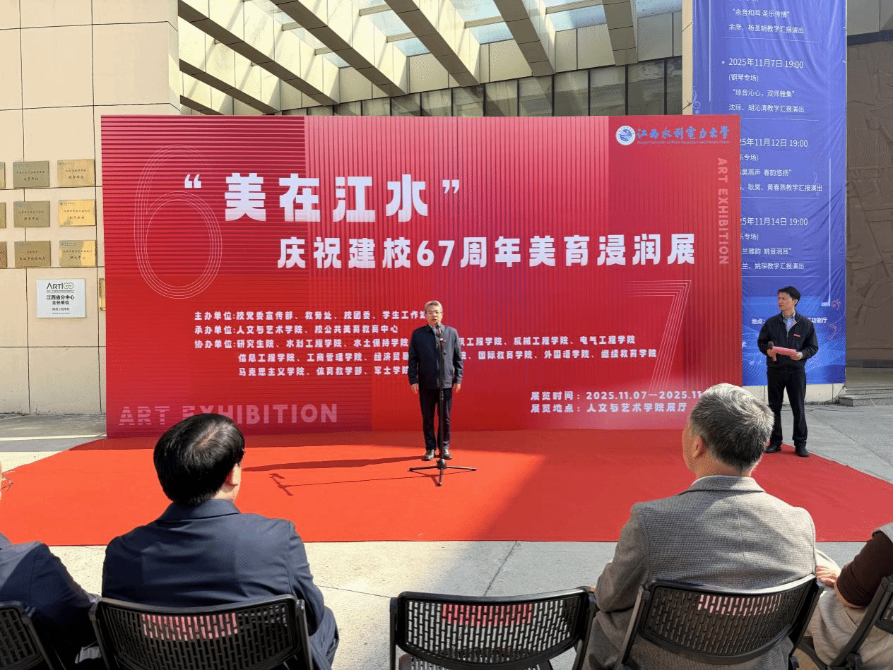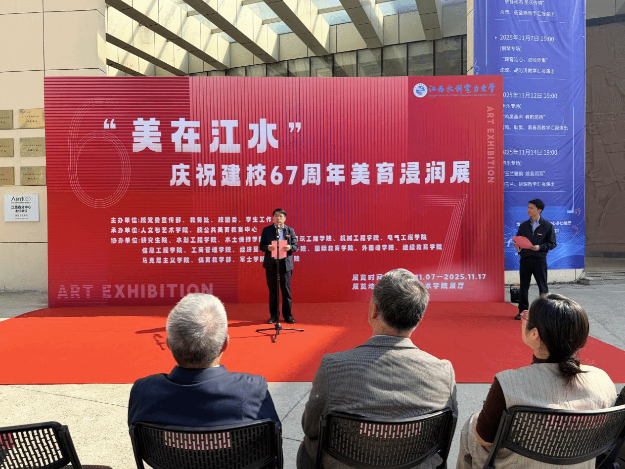 11月7日,“美在江水——庆祝建校 67 周年美育浸润展”在人文与艺术学院展厅开幕。校纪委书记殷安全宣布展览开幕,副校长周仲魁为展览致辞,展览主办、承办等单位负责人参加。水土保持学院2025级农业水利工程学生罗韵卿、人文与艺术学院教师陈俊晶分别作为学生代表和教师代表作发言。