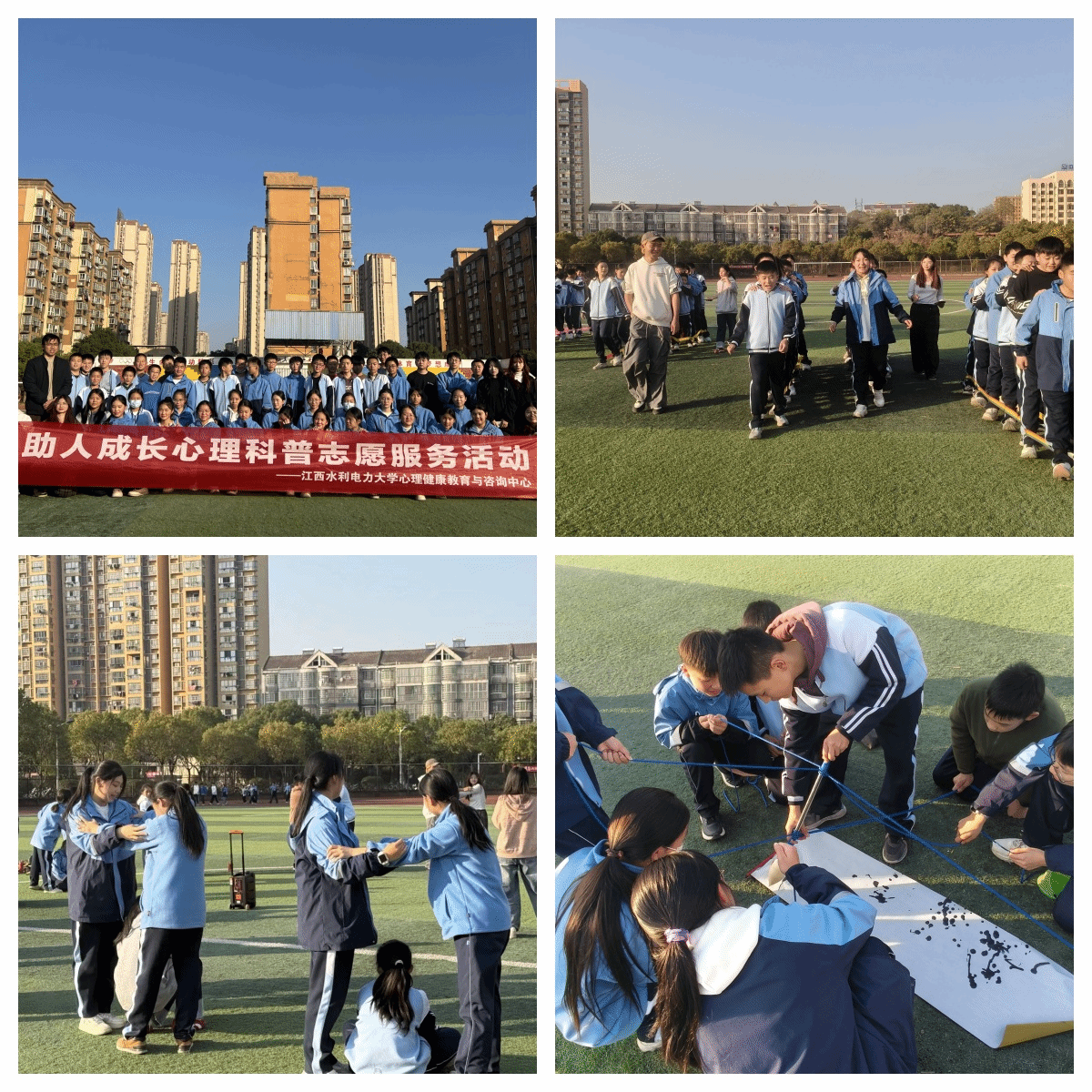 活动中,我校师生志愿者带领莲塘四中学生开展了系列心理素质拓展活动。“松鼠与大树”环节有效促进团队破冰与适应力提升;“有轨电车”项目引导学生通过实践体会沟通协作与团队默契的重要性;“神笔马良”任务则通过集体操控巨笔书写,深化学生对目标聚焦与策略协同的理解。整场活动气氛热烈有序,学生在体验中激发了自身积极情绪,强化了集体归属感。