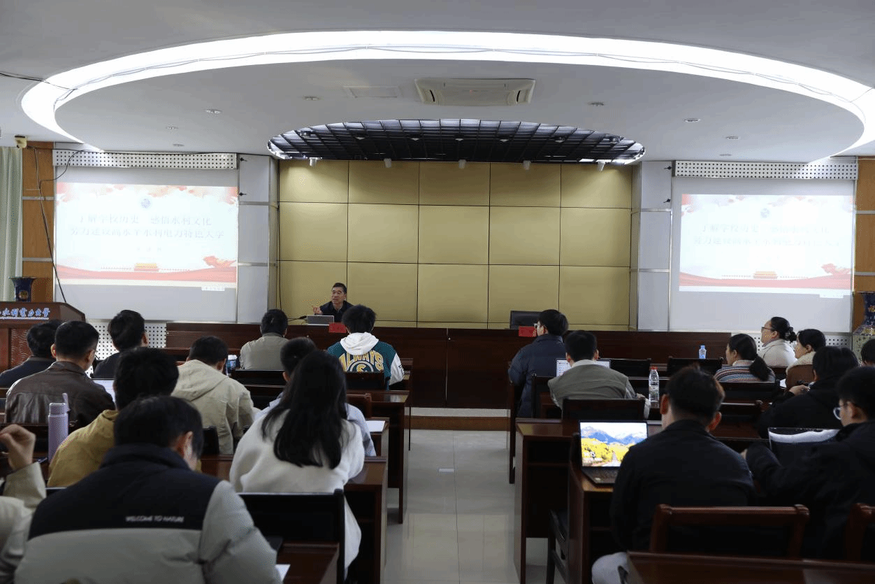 11月28日,校党委副书记吴泽俊在行政楼五楼会议室为近50名新入职教师作《了解学校历史 感悟水利文化 努力建设高水平水利电力特色大学》专题讲座。