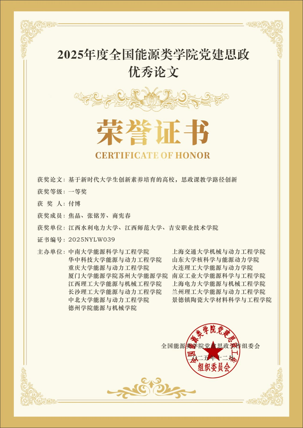近日,2025年度全国能源类学院党建思政优秀论文及优秀工作案例评选结果公布,我校电气工程学院在此次评选中表现突出,荣获多项奖励。其中付博团队报送的论文《基于新时代大学生创新素养培育的高校思政课教学路径创新》荣获党建思政优秀论文一等奖;由电气工程学院学生第一党支部报送的《“源网荷储”四维协同,党建引领培育新时代电力红色工匠的创新实践》党建品牌案例荣获党建思政优秀工作案例二等奖(团队成员:付博、焦晶、张敏超、周宇);由涂怀谋团队报送的案例《“五位一体,成长赋能”:新时代高校优良学风班级培育实践案例荣获优秀案例》荣获党建思政优秀工作案例三等奖。