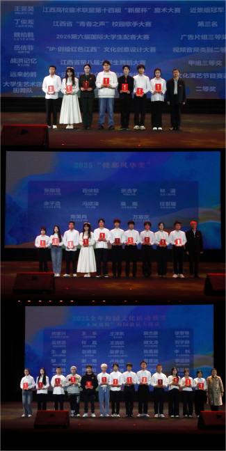 与会领导分别为2025年省级及以上校园文化领域获奖代表、校级校园文化活动获奖代表以及《赣鄱流韵长》突出贡献奖代表颁奖。